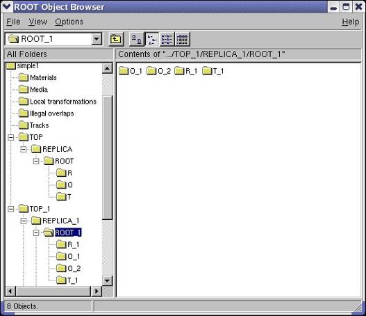 The folders Materials, Media and Local transformations are in fact the containers where the geometry manager stores the corresponding objects. The Illegal overlaps folder is empty but can be filled after performing a geometry validity check (see section: "Checking the