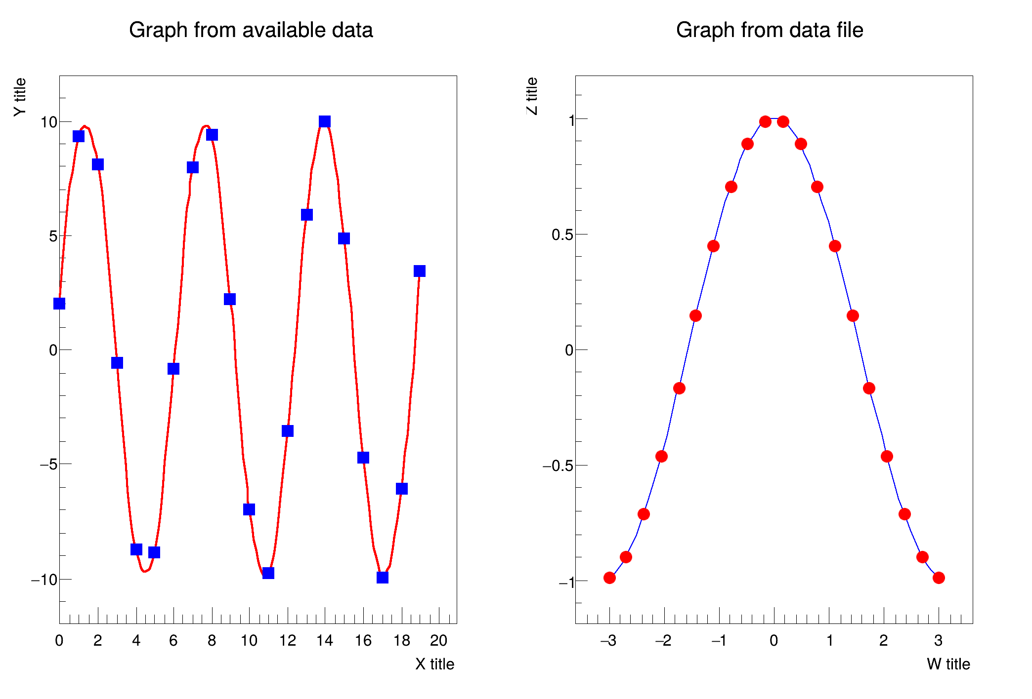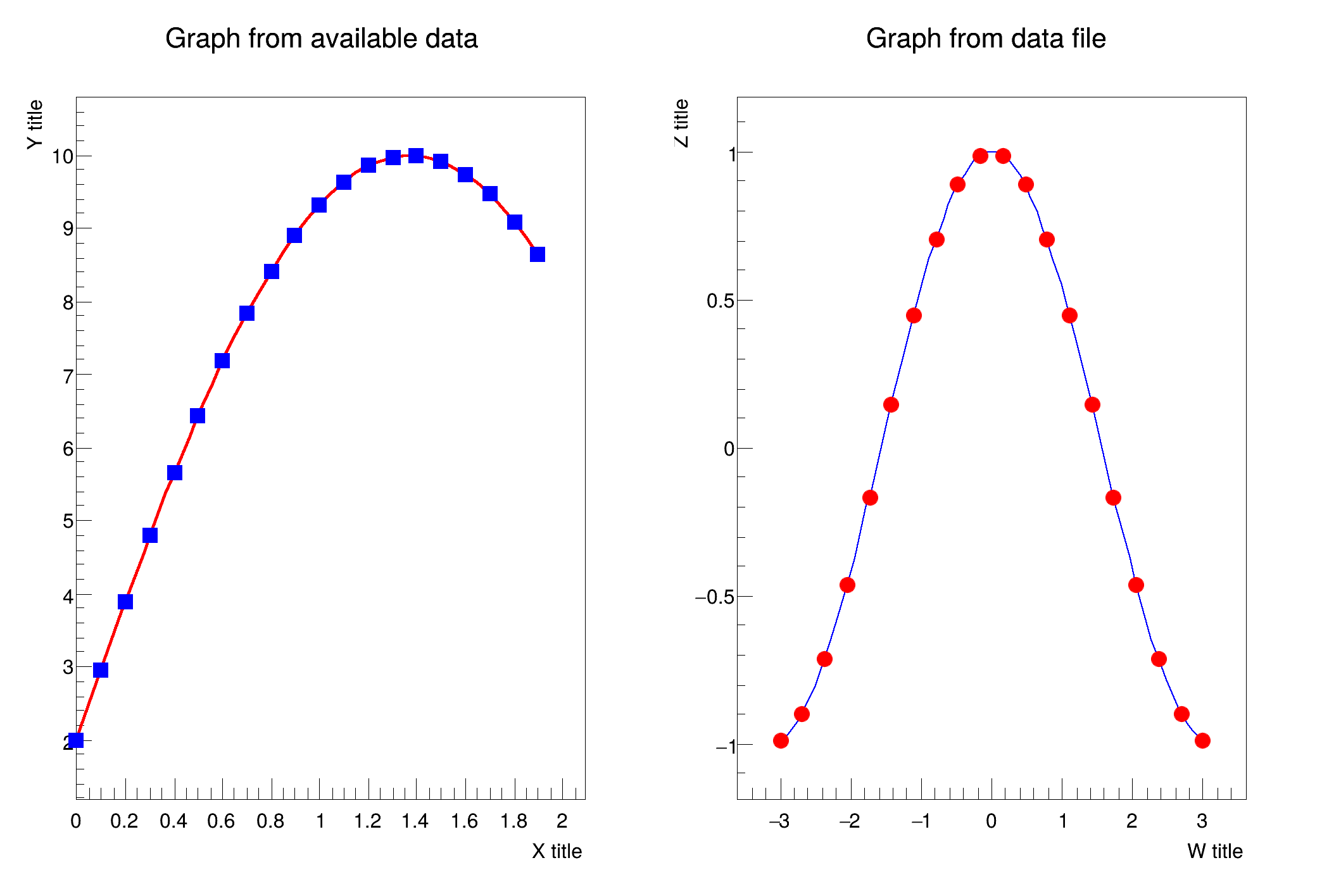 A TGraph is an object made of two arrays X and Y with n points each. ROOT can create TGraphs automatically by reading a text file (e.g. CSV), using a function, another TGraph, histogram, vectors, arrays, or even by adding pairs of points one by one.