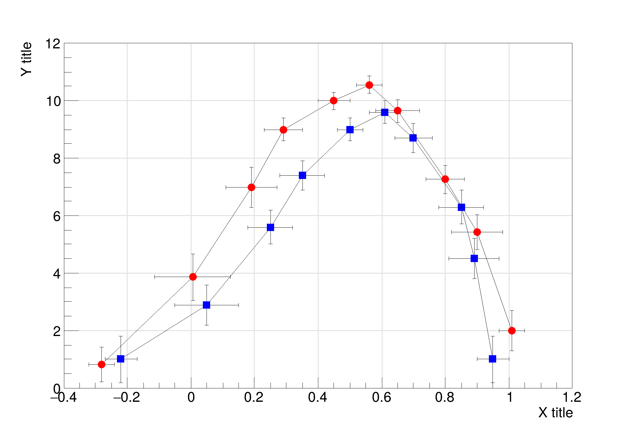 | gr003_errors2.C | gr003_errors2.py | Create and draw two graphs with error bars, superposed on the same canvas (not using TMultiGraph). |