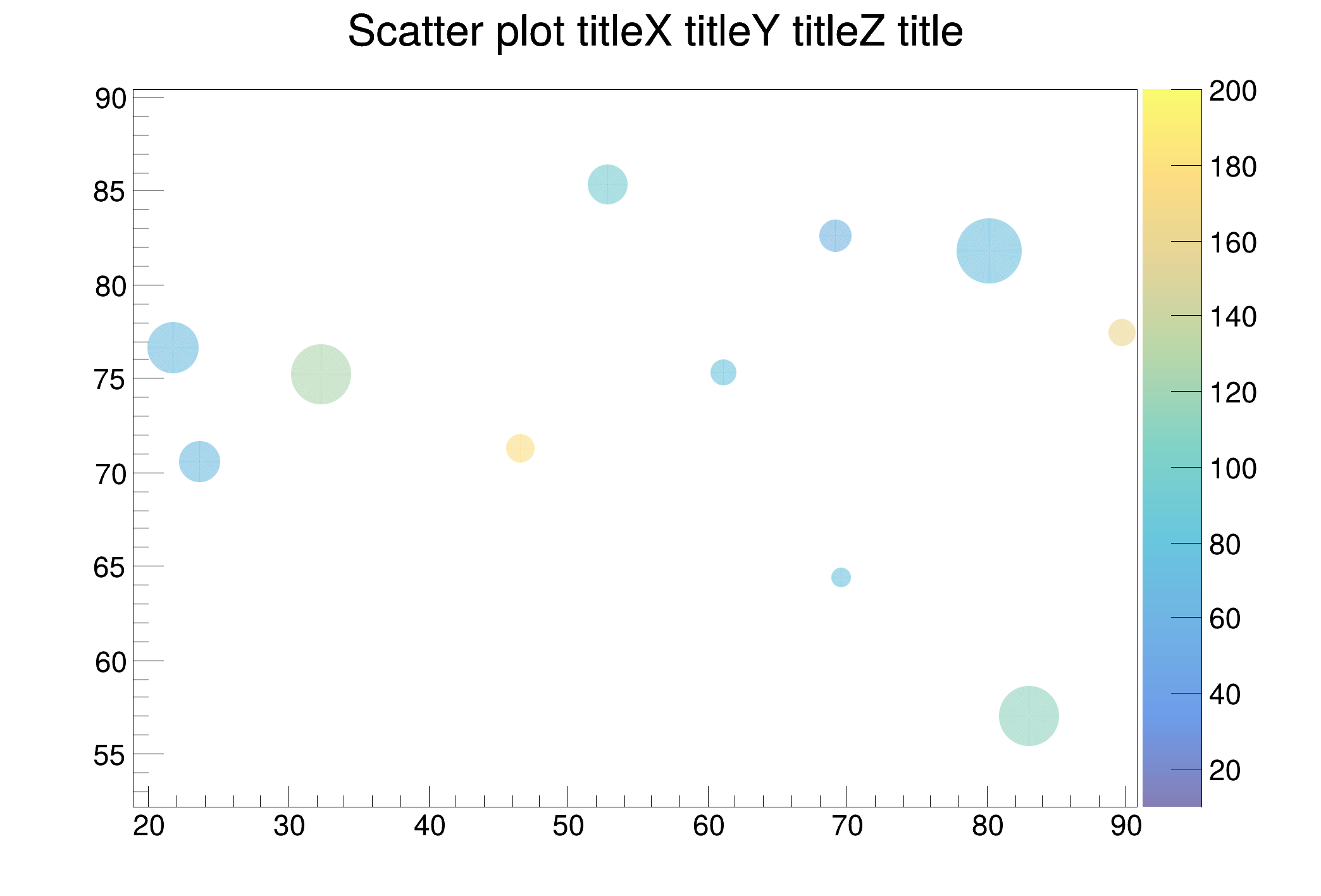 | gr006_scatter.C | gr006_scatter.py | Scatter plot for 4 variables, mapped to: x, y, marker color and marker size. |