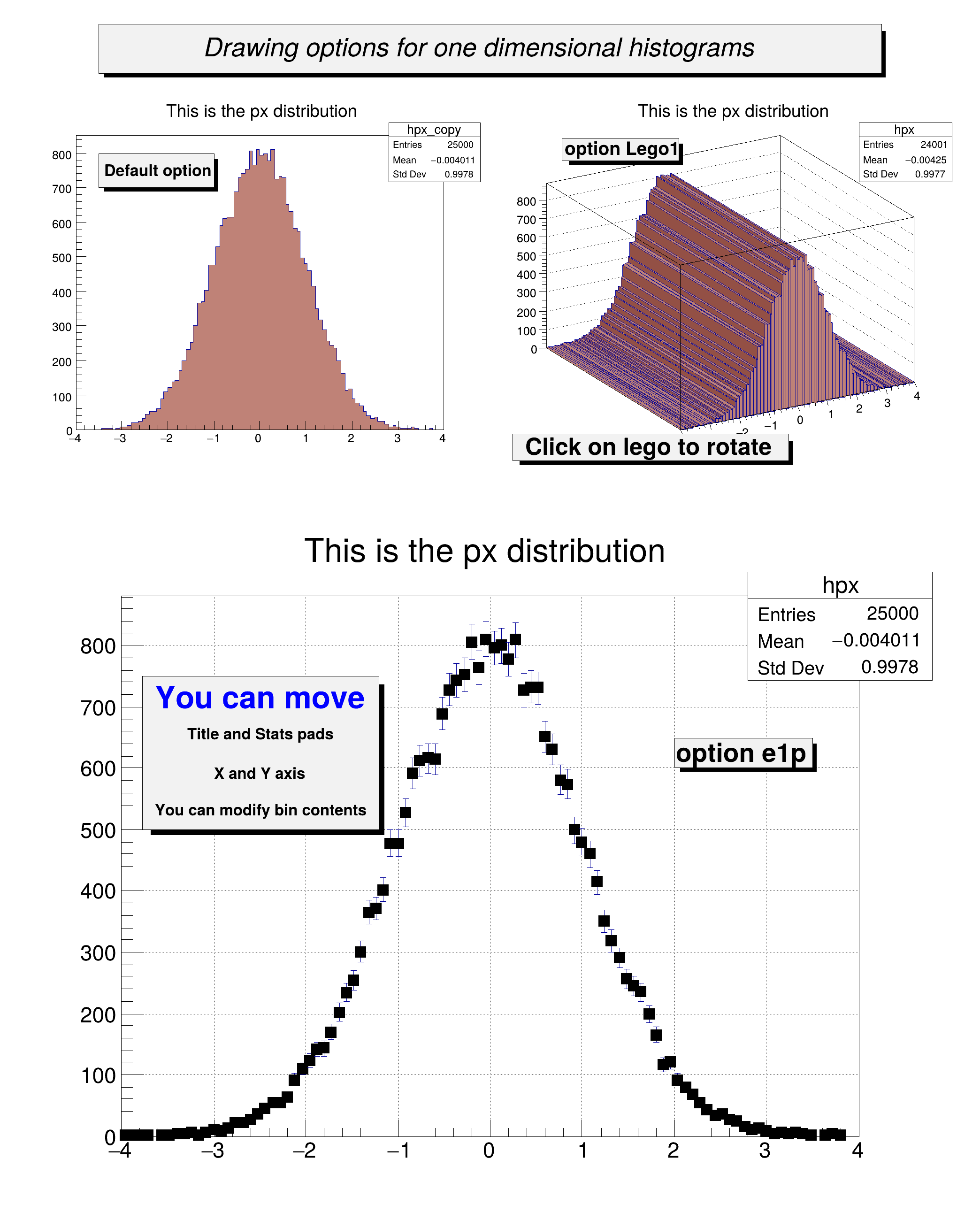A histogram is a visual representation of the distribution of quantitative data. TH1 class introduces the basic data structure used in root for histograms.