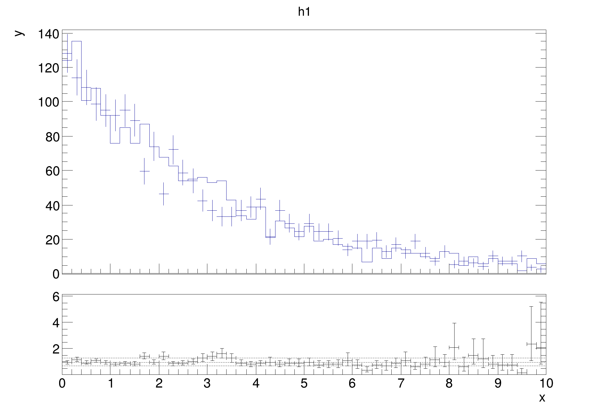 Two histograms are set up and filled with random numbers. The constructor of TRatioPlot takes the to histograms, name and title for the object, drawing options for the histograms (hist and E in this case) and a drawing option for the output graph. Inspired by the tutorial of Paul Gessinger.