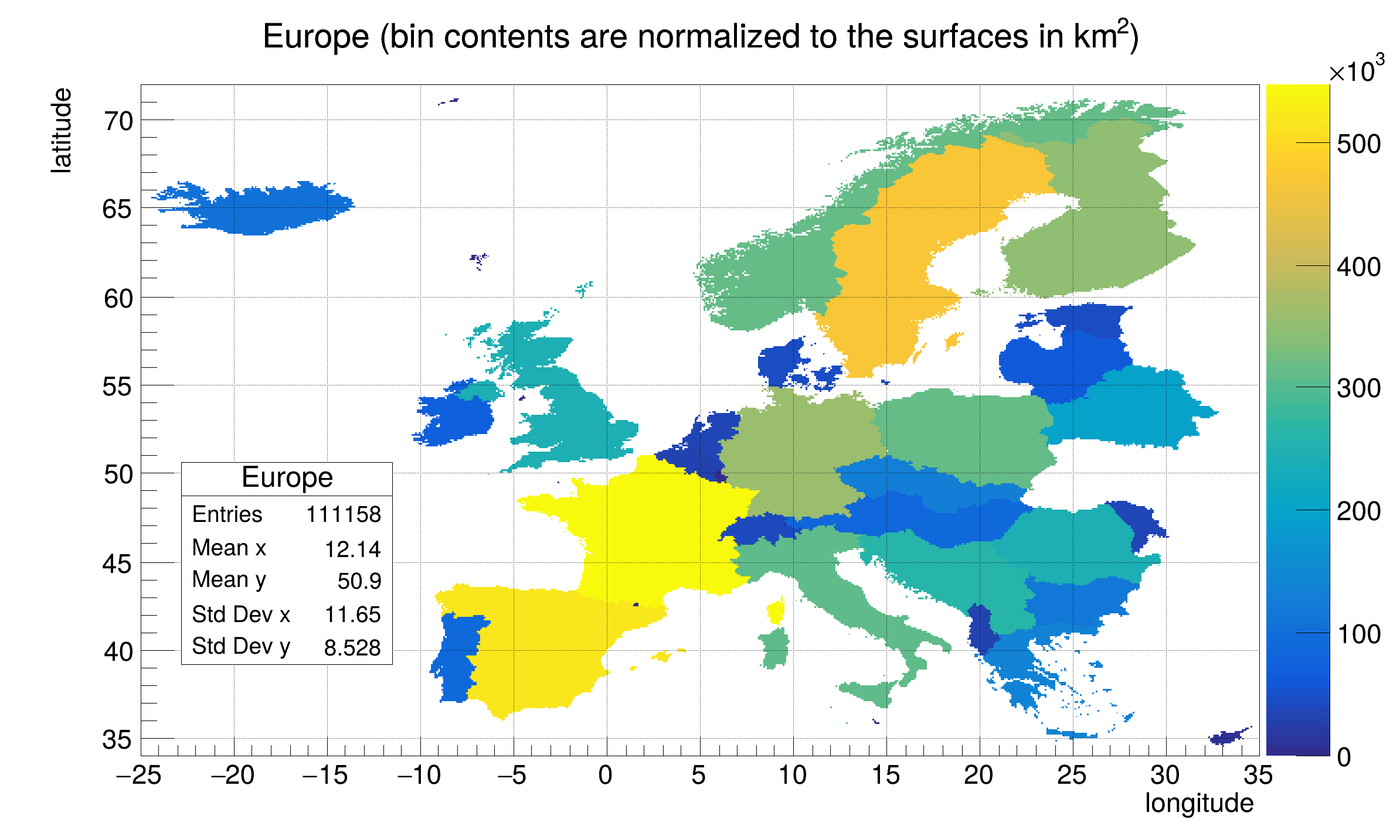 The initial data are stored in TMultiGraphs. They represent the european countries. The histogram filling is done according to a Mercator projection, therefore the bin contains should be proportional to the real surface of the countries.