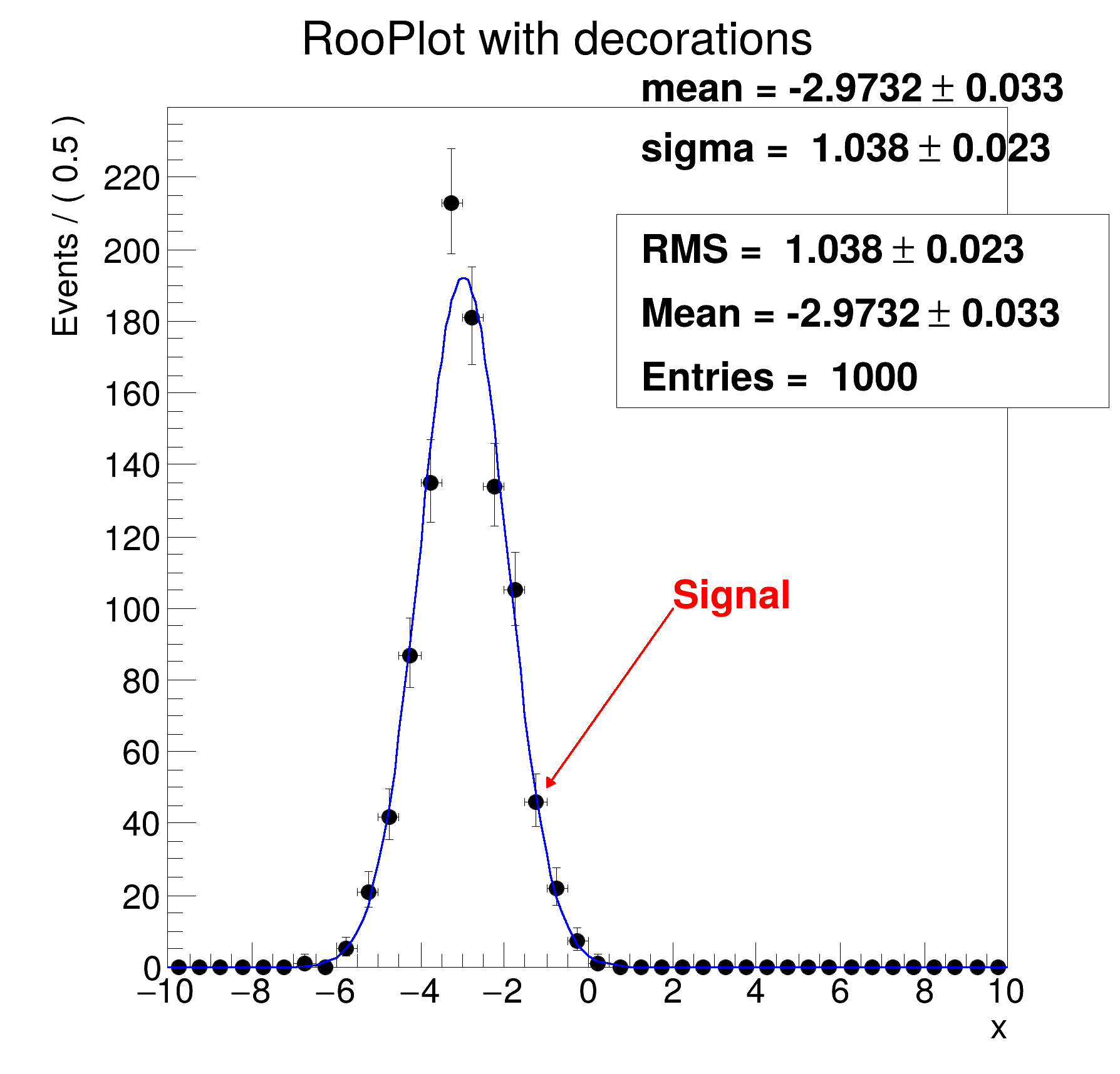 Basic functionality: adding boxes with parameters to RooPlots and decorating with arrows, etc...