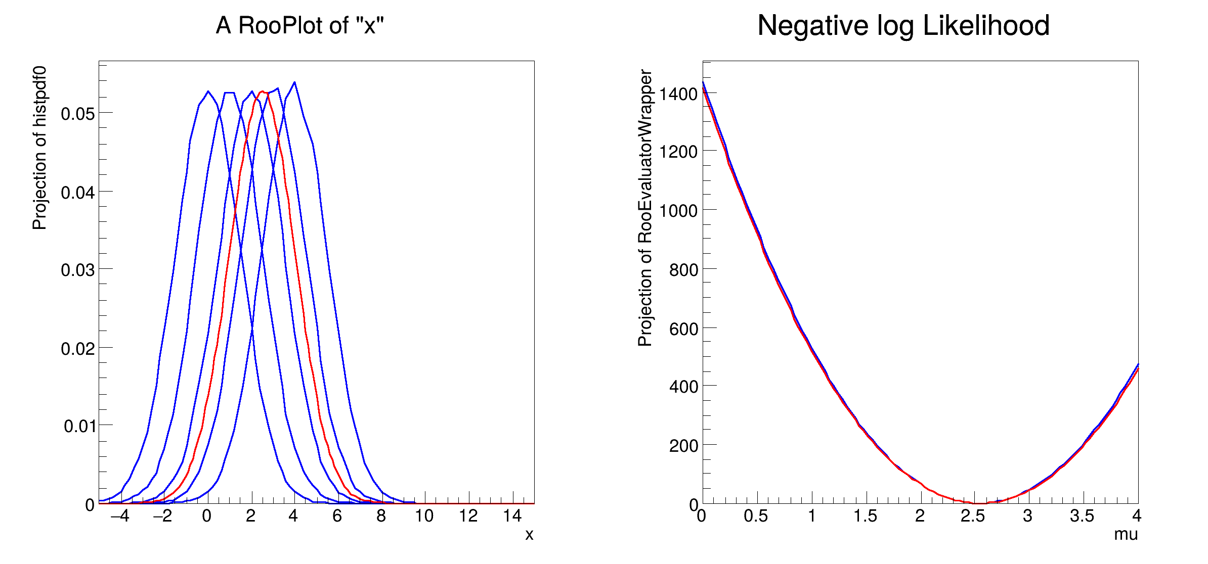 This tutorial shows how to use template morphing inside RooFit. As input we have several Gaussian distributions. The output is one gaussian, with a specific mean value. Since likelihoods are often used within the framework of morphing, we provide a way to estimate the negative log likelihood (nll).