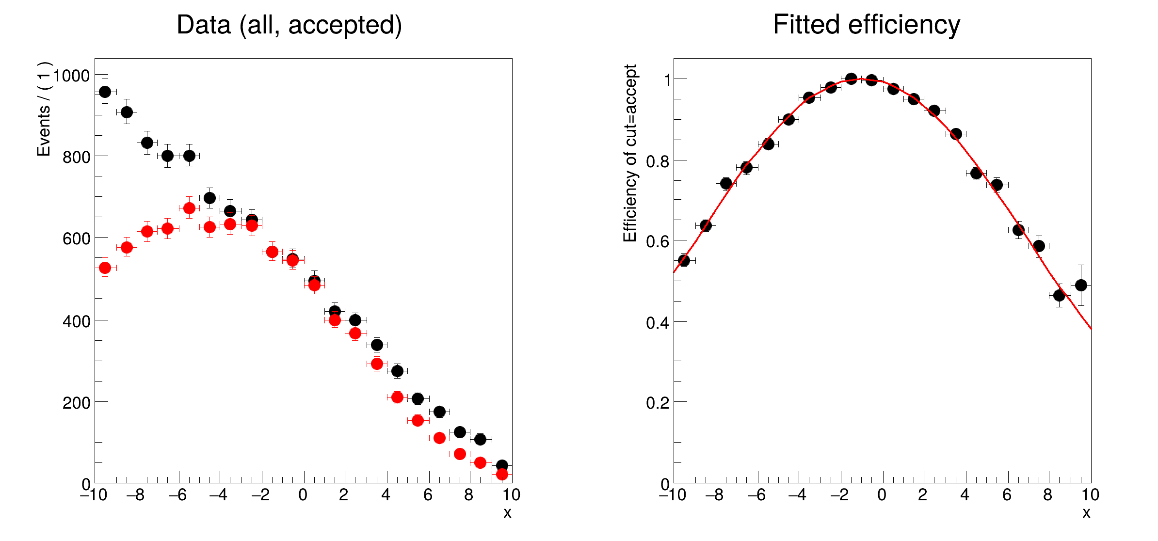 Special pdf's: unbinned maximum likelihood fit of an efficiency eff(x) function to a dataset D(x,cut), cut is a category encoding a selection, which the efficiency as function of x should be described by eff(x)