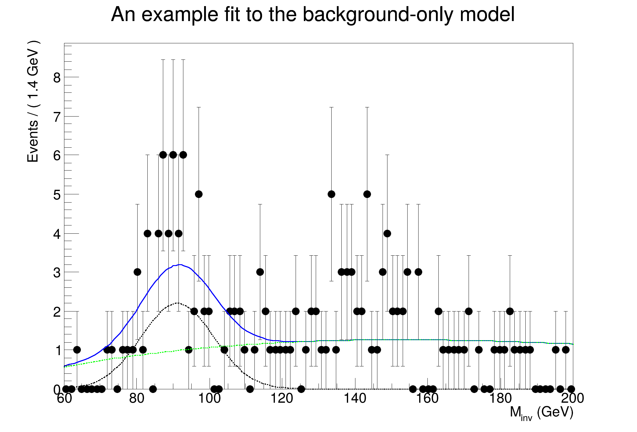 The macro creates a simple signal model and two background models, which are added to a RooWorkspace. The macro creates a toy dataset, and then uses a RooStats ProfileLikleihoodCalculator to do a hypothesis test of the background-only and signal+background hypotheses. In this example, shape uncertainties are not taken into account, but normalization uncertainties are.