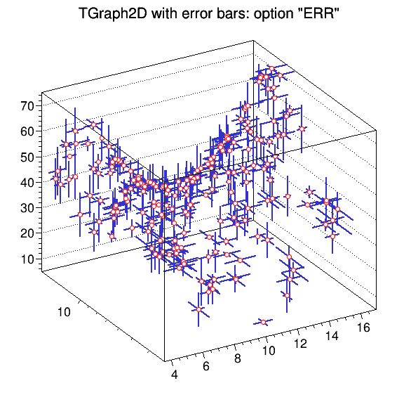 A TGraph2DErrors is a TGraph2D with errors. It behaves like a TGraph2D and has the same drawing options.