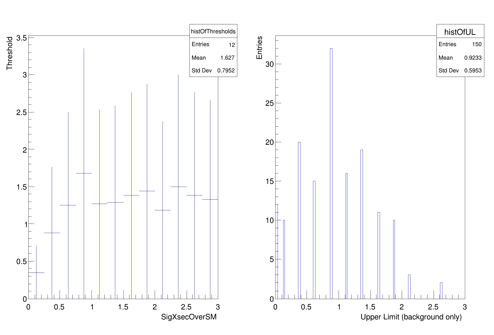 this tells you the values of the parameters being used to generate the pseudo-experiments and the threshold in this case is 0.011215. One would expect for 95% that the threshold would be ~1.35 once the cross-section is far enough away from 0 that it is essentially unaffected by the boundary. As one reaches the last points in the scan, the theshold starts to get artificially high. This is because the range of the parameter in the fit is the same as the range in the scan. In the future, these should be independently controlled, but they are not now. As a result the ~50% of pseudo-experiments that have an upward fluctuation end up with muhat = muMax. Because of this, the upper range of the parameter should be well above the expected upper limit... but not too high or one will need a very large value of nPointsToScan to resolve the relevant region. This can be improved, but this is the first version of this script.