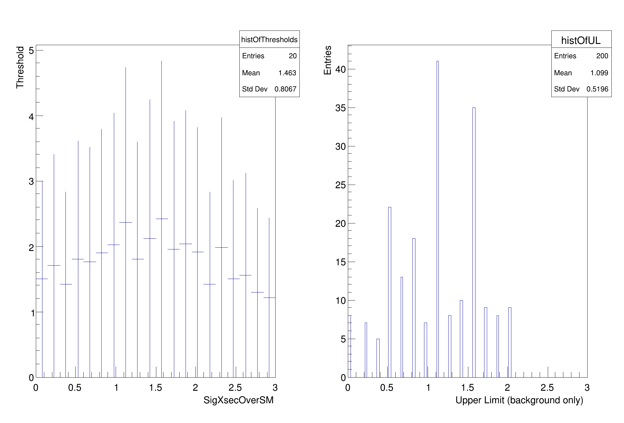 this tells you the values of the parameters being used to generate the pseudo-experiments and the threshold in this case is 0.011215. One would expect for 95% that the threshold would be ~1.35 once the cross-section is far enough away from 0 that it is essentially unaffected by the boundary. As one reaches the last points in the scan, the theshold starts to get artificially high. This is because the range of the parameter in the fit is the same as the range in the scan. In the future, these should be independently controlled, but they are not now. As a result the ~50% of pseudo-experiments that have an upward fluctuation end up with muhat = muMax. Because of this, the upper range of the parameter should be well above the expected upper limit... but not too high or one will need a very large value of nPointsToScan to resolve the relevant region. This can be improved, but this is the first version of this script.