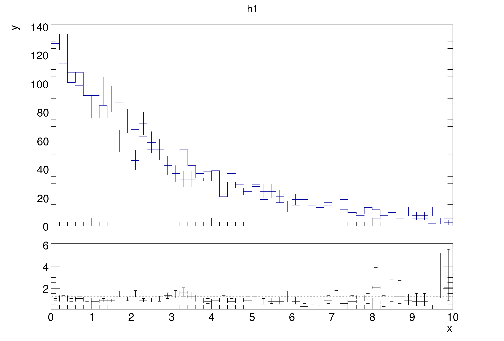 Two histograms are set up and filled with random numbers. The constructor of TRatioPlot takes the to histograms, name and title for the object, drawing options for the histograms (hist and E in this case) and a drawing option for the output graph.