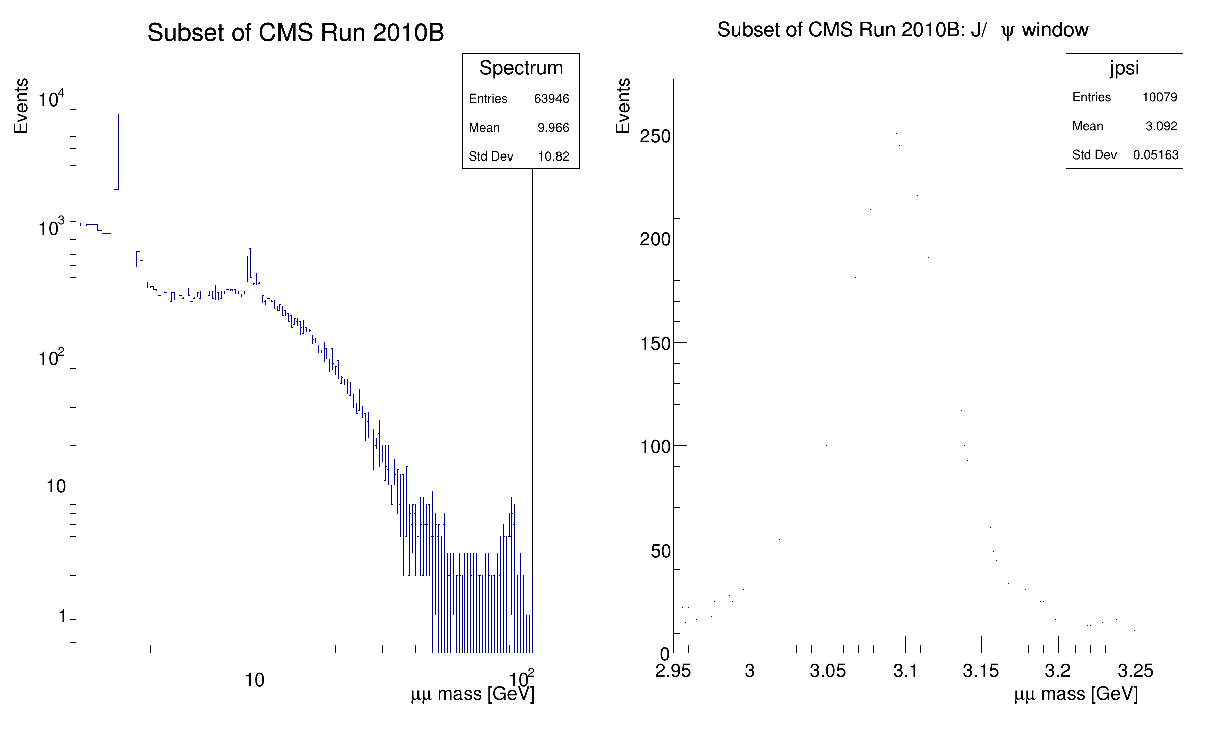 filteredEvents.Histo1D({"Spectrum", "Subset of CMS Run 2010B;#mu#mu mass [GeV];Events", 1024, 2, 110}, "m");