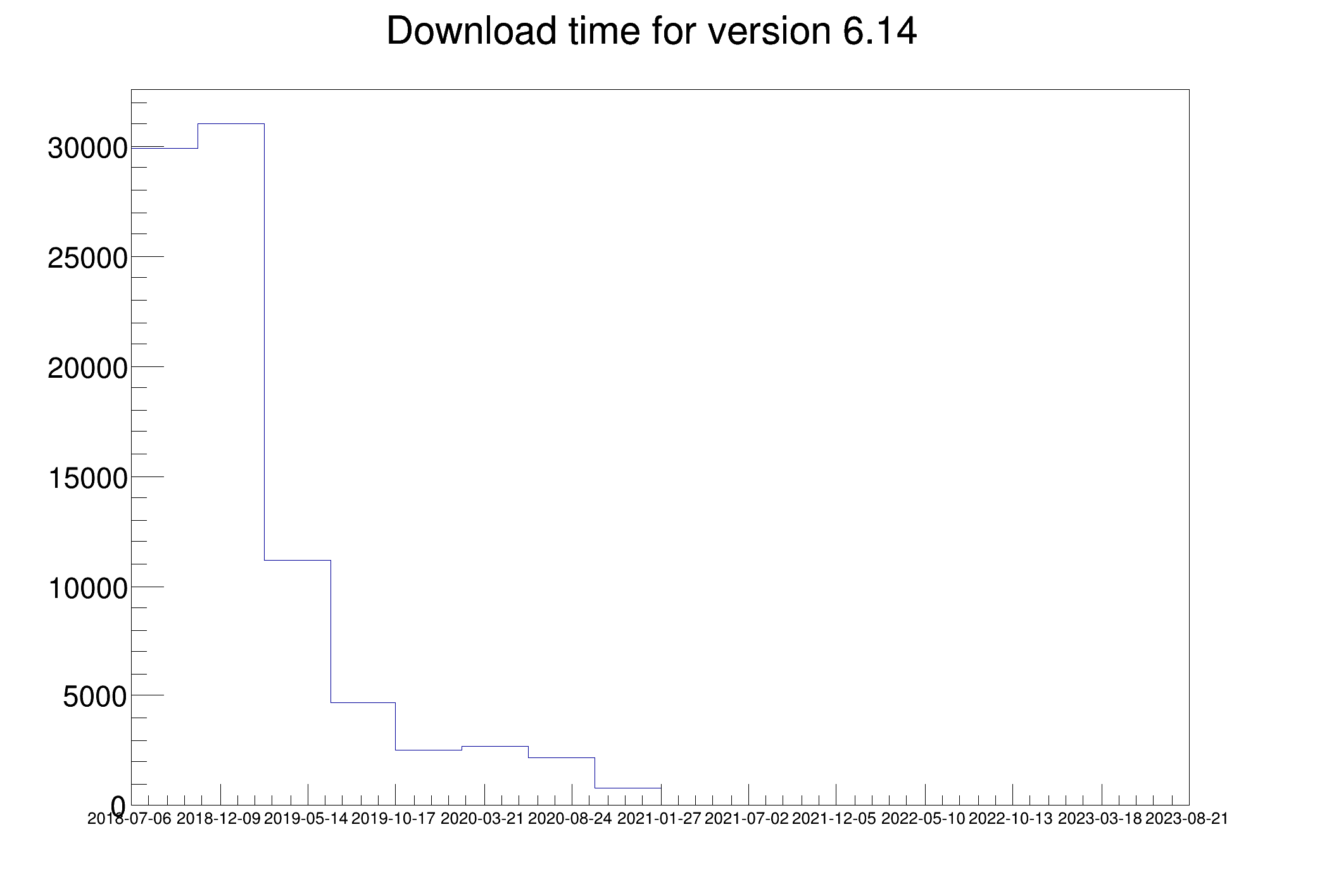 .Histo1D({"h614", "Download time for version 6.14", 16, minTime, now}, {"datime"});
