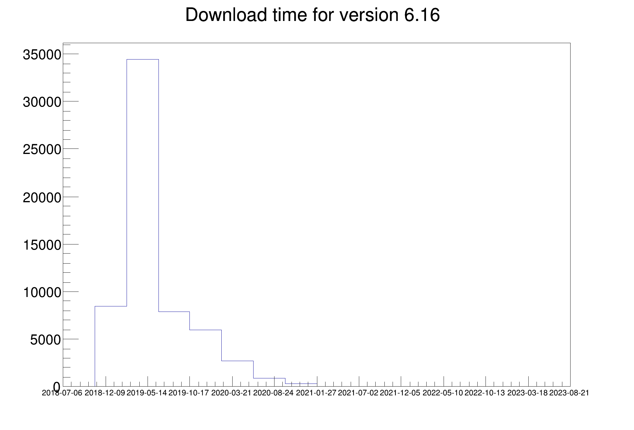 .Histo1D({"h616", "Download time for version 6.16", 16, minTime, now}, {"datime"});