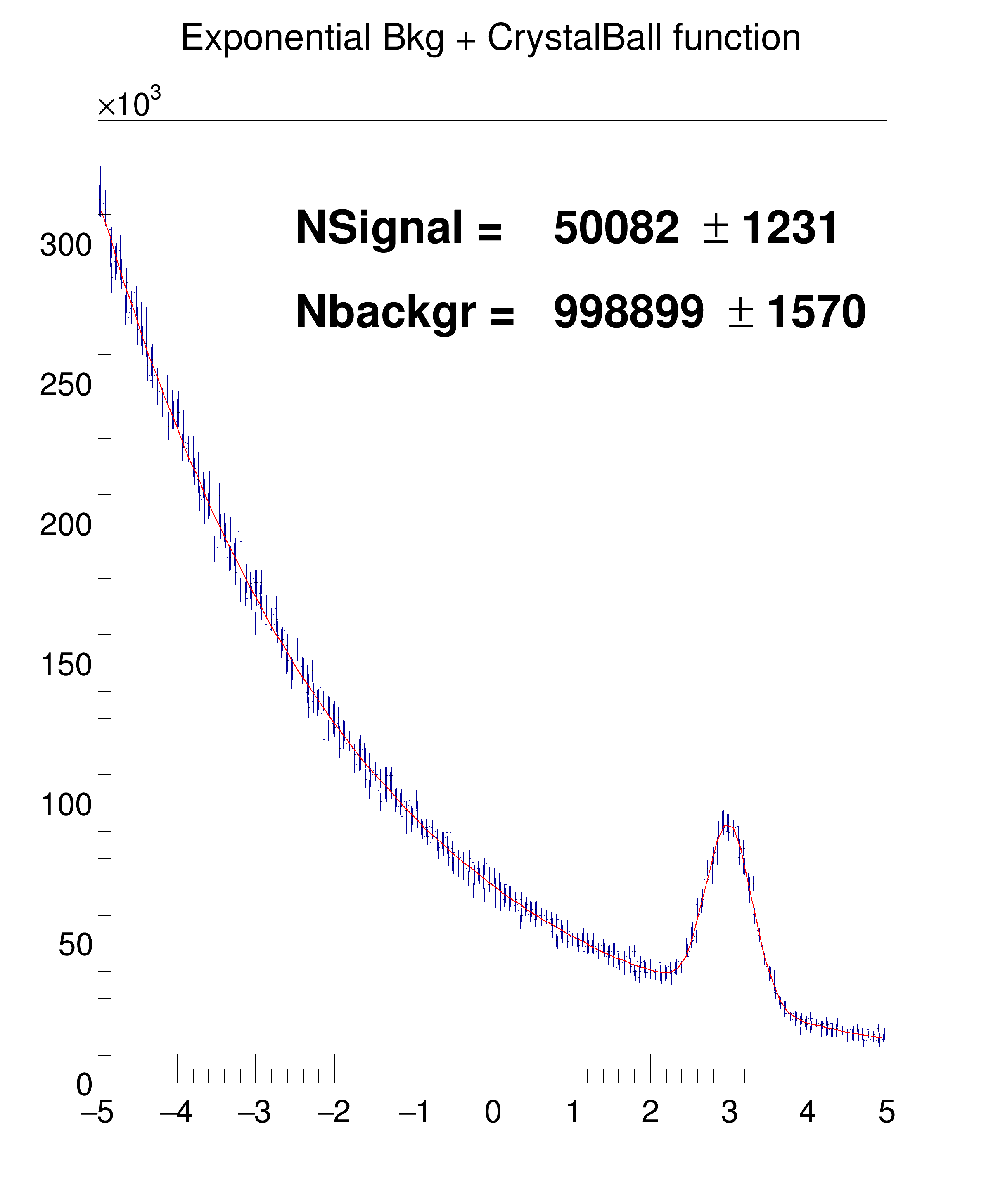 "Exponential Bkg + CrystalBall function", nBins, -5., 5.);