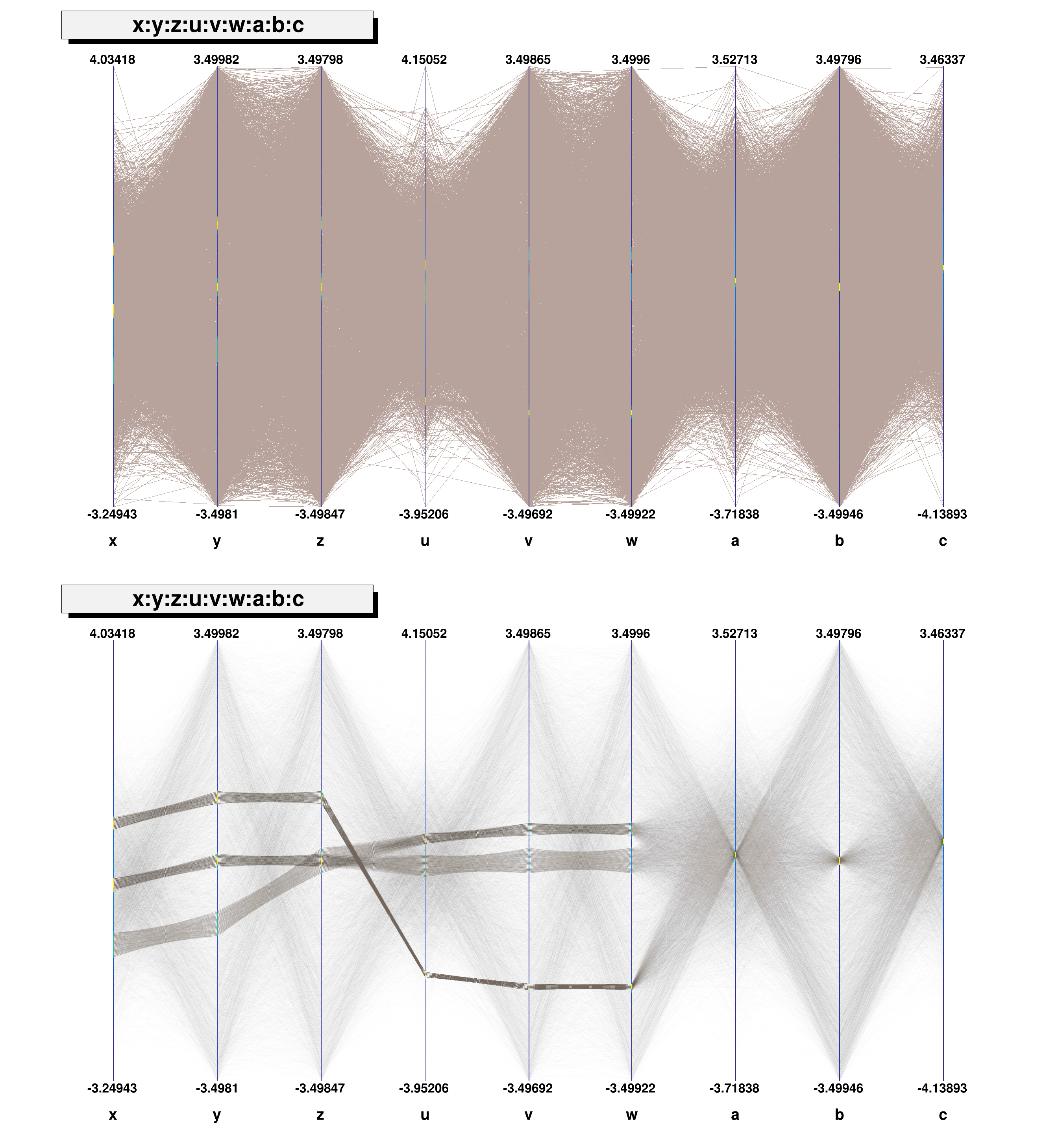 nt->Draw("x:y:z:u:v:w:a:b:c","","para");