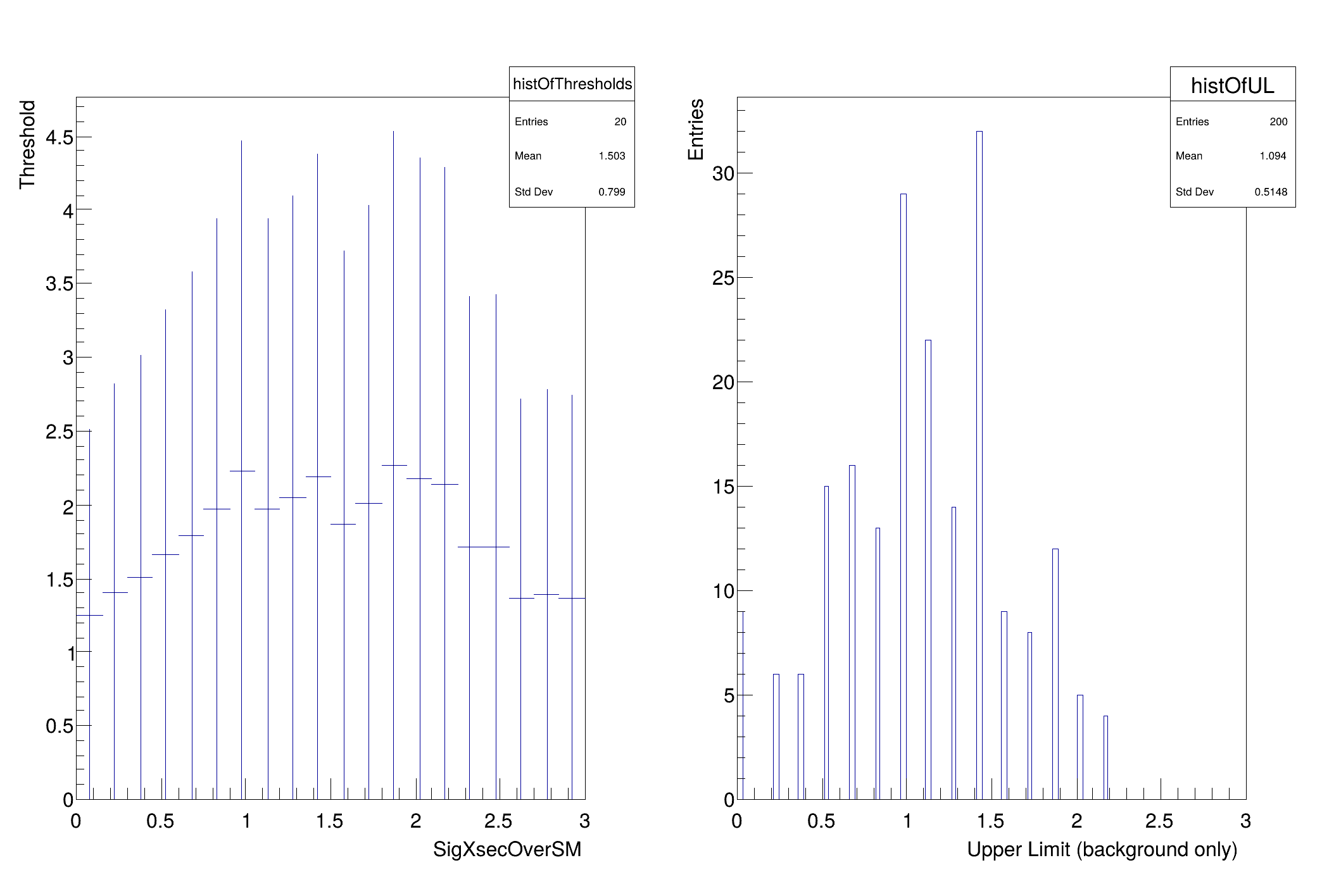 this tells you the values of the parameters being used to generate the pseudo-experiments and the threshold in this case is 0.011215. One would expect for 95% that the threshold would be ~1.35 once the cross-section is far enough away from 0 that it is essentially unaffected by the boundary. As one reaches the last points in the scan, the threshold starts to get artificially high. This is because the range of the parameter in the fit is the same as the range in the scan. In the future, these should be independently controlled, but they are not now. As a result the ~50% of pseudo-experiments that have an upward fluctuation end up with muhat = muMax. Because of this, the upper range of the parameter should be well above the expected upper limit... but not too high or one will need a very large value of nPointsToScan to resolve the relevant region. This can be improved, but this is the first version of this script.