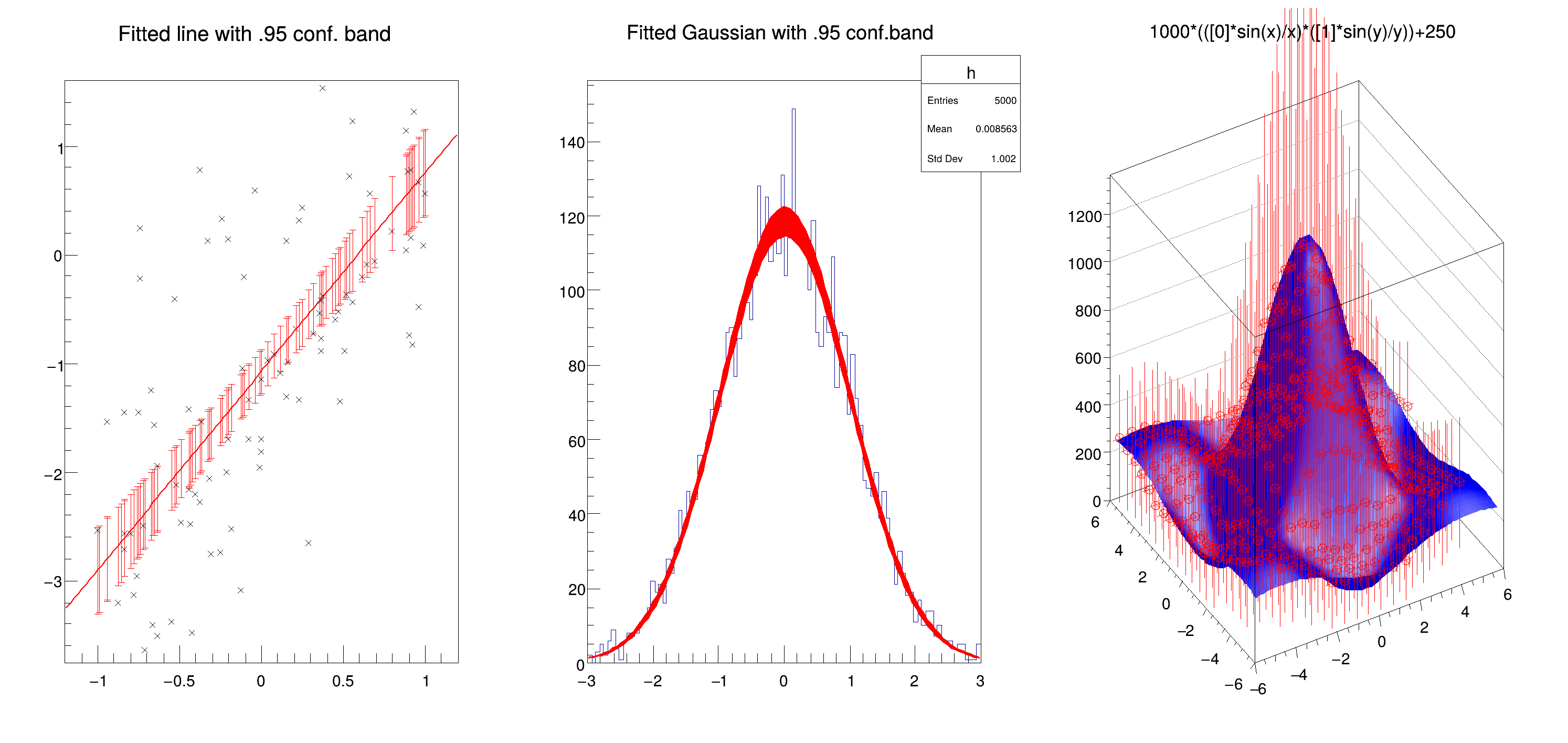 Illustrates TVirtualFitter::GetConfidenceIntervals This method computes confidence intervals for the fitted function