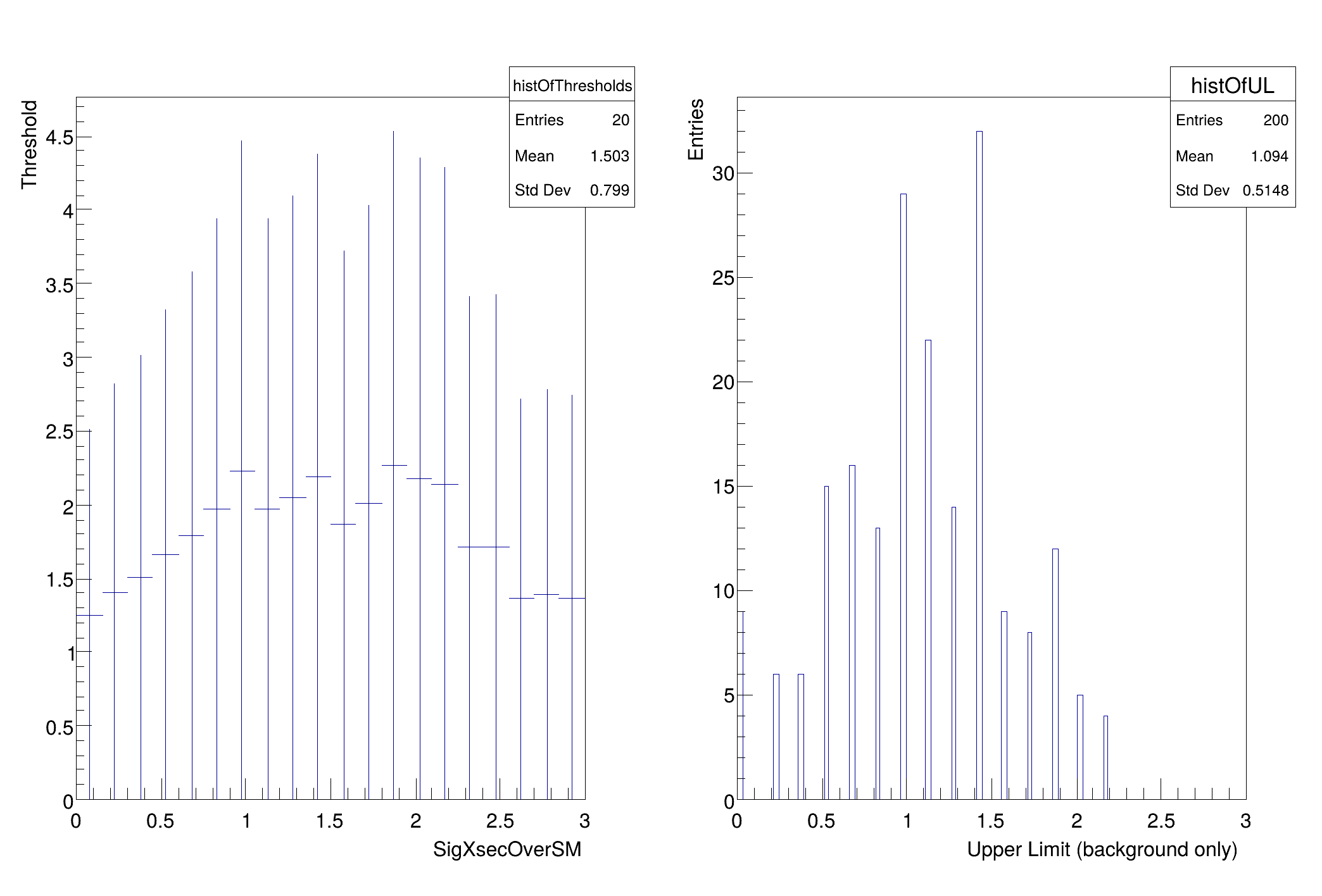 this tells you the values of the parameters being used to generate the pseudo-experiments and the threshold in this case is 0.011215. One would expect for 95% that the threshold would be ~1.35 once the cross-section is far enough away from 0 that it is essentially unaffected by the boundary. As one reaches the last points in the scan, the threshold starts to get artificially high. This is because the range of the parameter in the fit is the same as the range in the scan. In the future, these should be independently controlled, but they are not now. As a result the ~50% of pseudo-experiments that have an upward fluctuation end up with muhat = muMax. Because of this, the upper range of the parameter should be well above the expected upper limit... but not too high or one will need a very large value of nPointsToScan to resolve the relevant region. This can be improved, but this is the first version of this script.