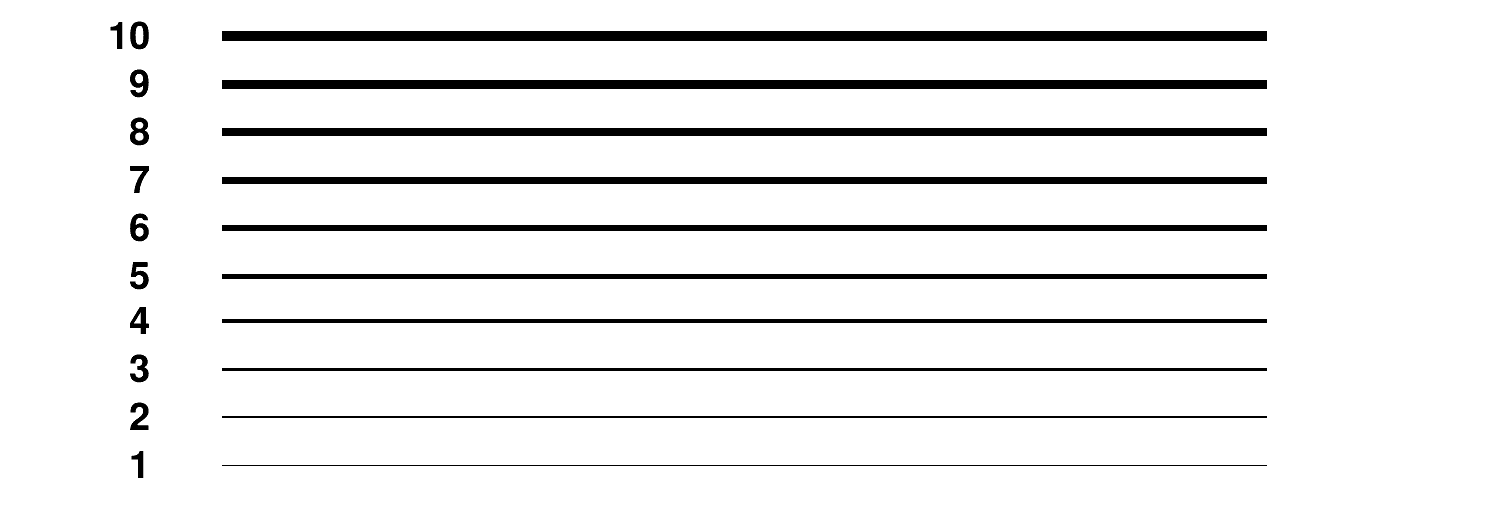 The line width is expressed in pixel units. The line width of any class inheriting from TAttLine can be changed using the method SetLineWidth and retrieved using the method GetLineWidth. The following picture shows the line widths from 1 to 10 pixels.