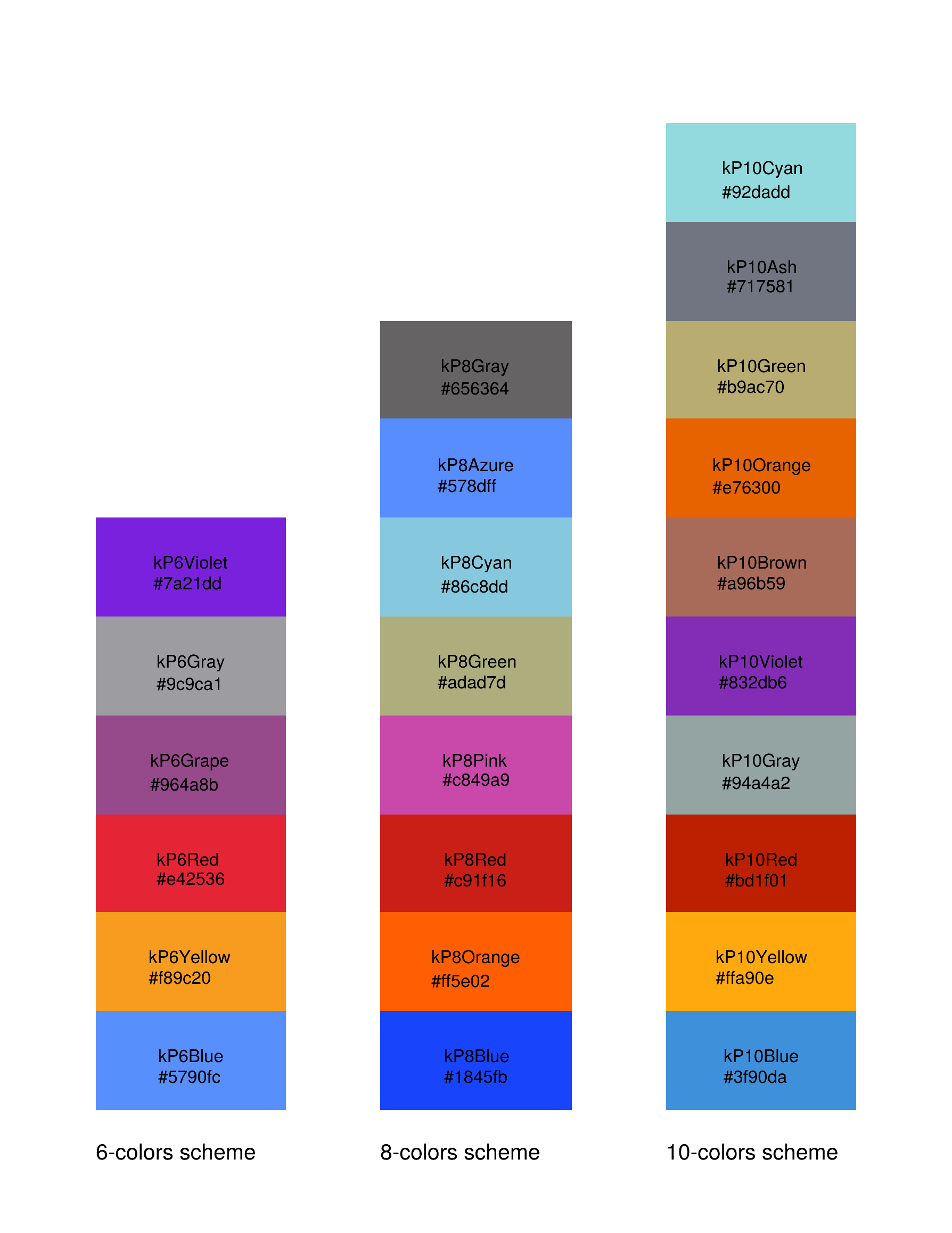 These three color schemes are available as color sets with 6, 8, and 10 colors, named kP[6, 8, 10]ColorName. For example, kP6Red represents the red color within the P6 color scheme (P for Petroff or Preferred).