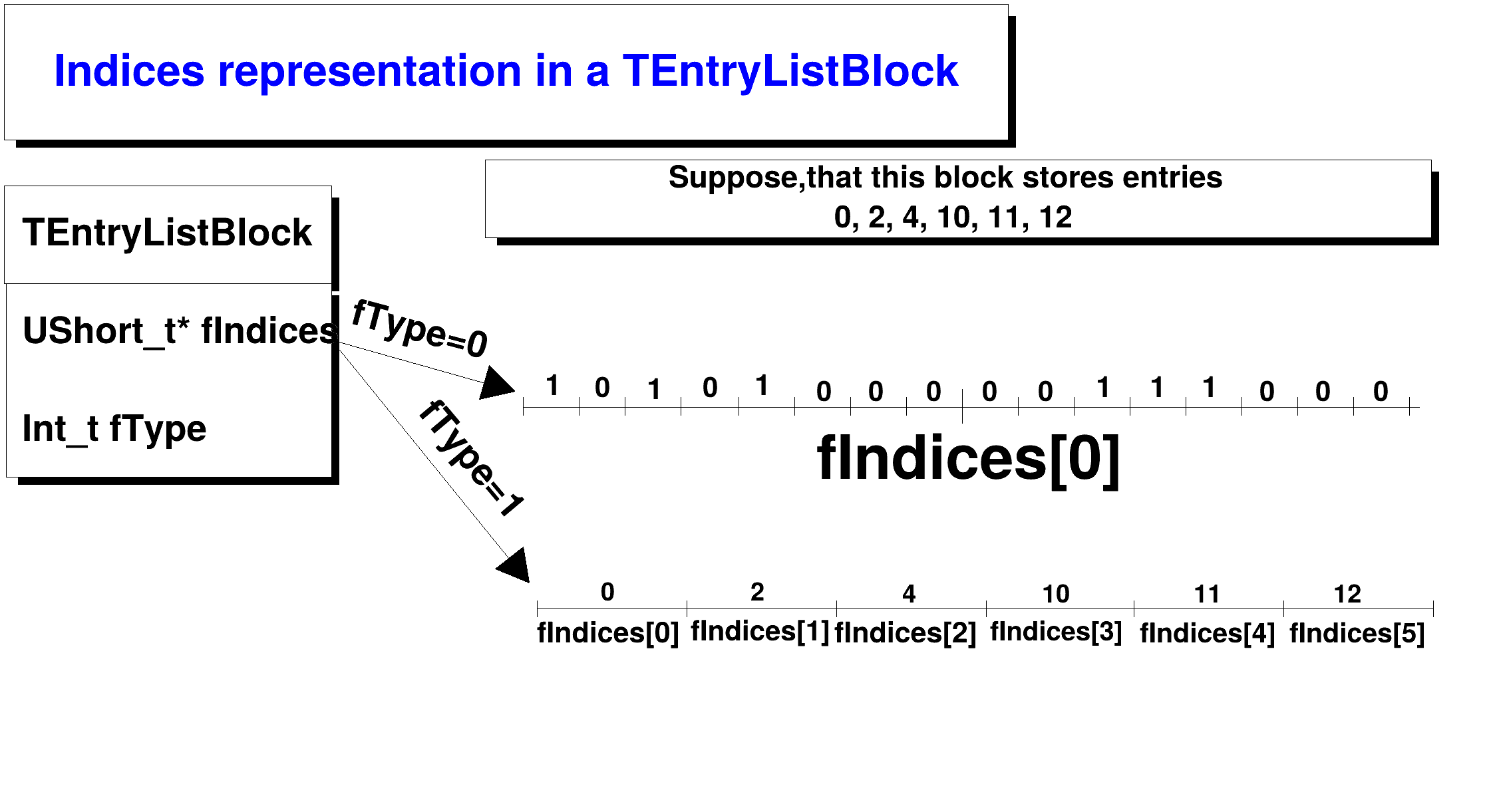 In both cases, a UShort_t* is used. The second option is better in case less than 1/16 or more than 15/16 of entries pass the selection, and the representation can be changed by calling OptimizeStorage() function. When the block is being filled, it's always stored as bits, and the OptimizeStorage() function is called by TEntryList when it starts filling the next block. If Enter() or Remove() is called after OptimizeStorage(), representation is again changed to 1).