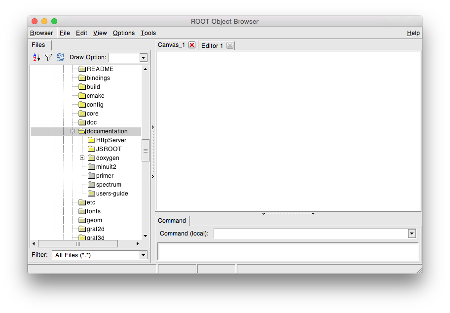Standard Root objects are automatically added to the folder hierarchy. For example, the following folders exist: root/Files with the list of currently connected Root files root/Classes with the list of active classes root/Geometries with active geometries root/Canvases with the list of active canvases root/Styles with the list of graphics styles root/Colors with the list of active colors