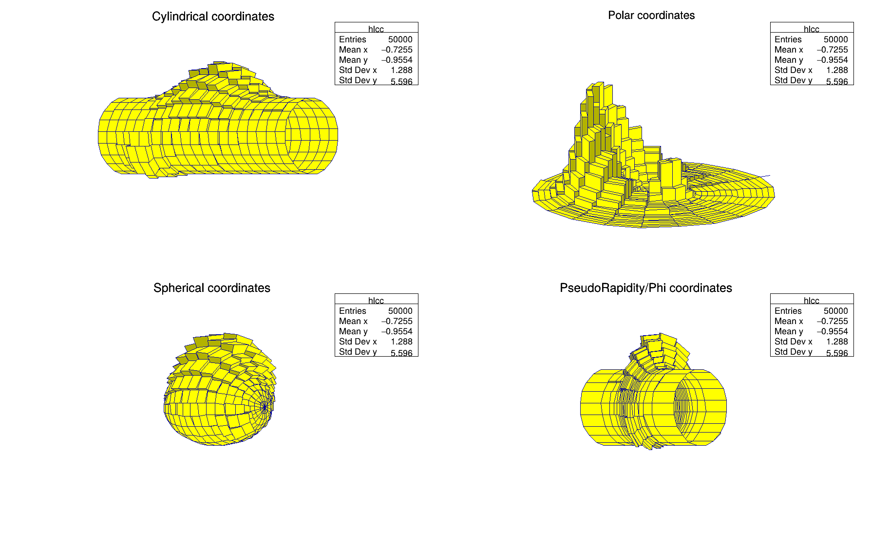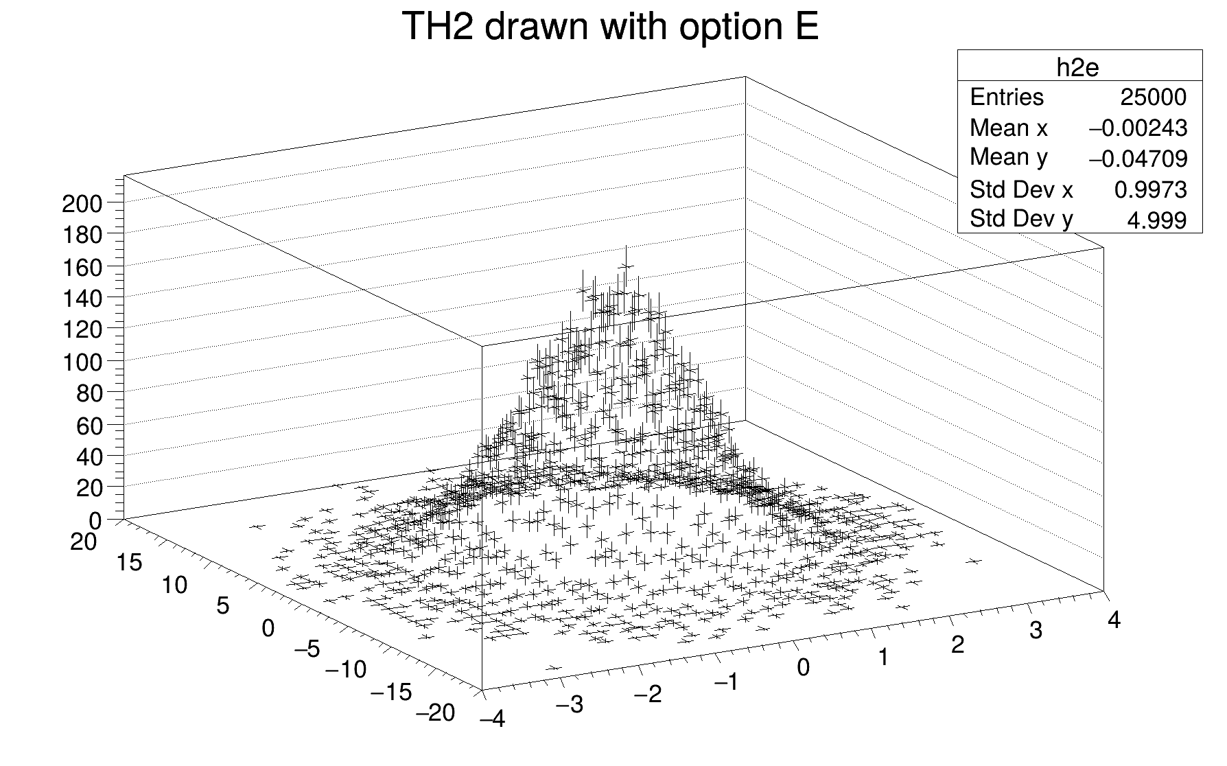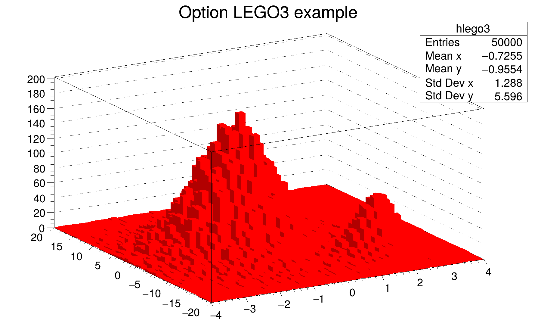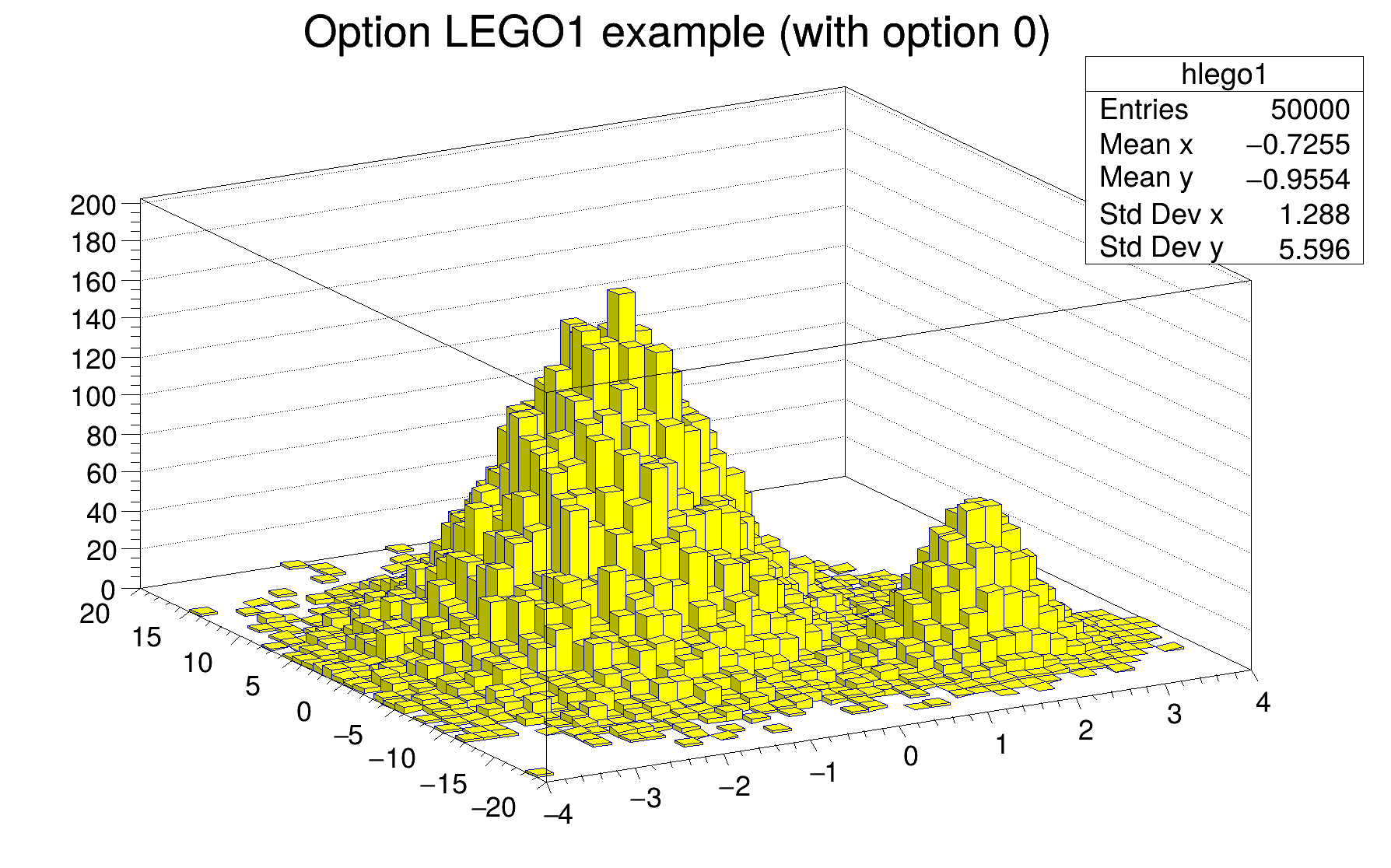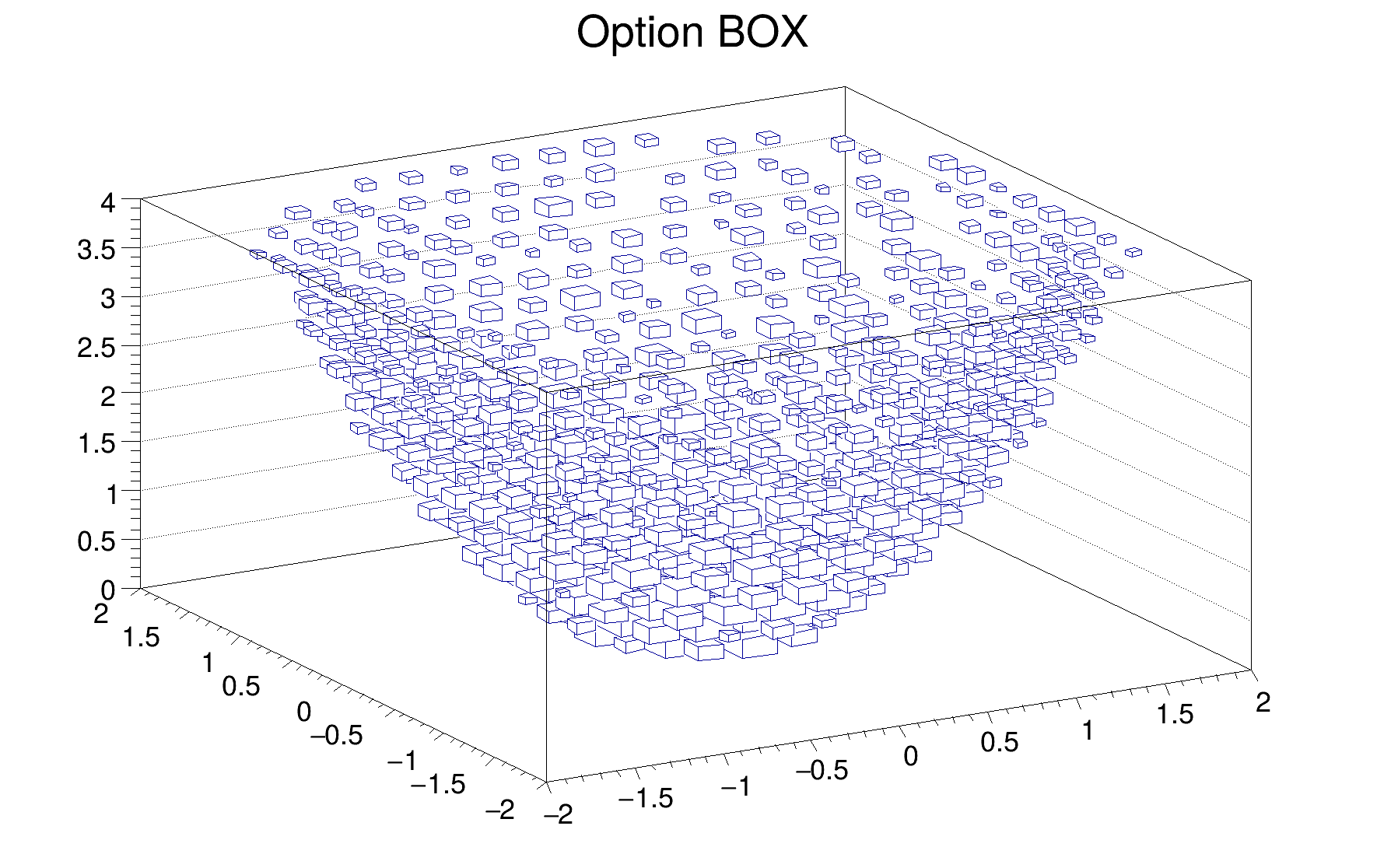 h can be of any kind: 1D, 2D or 3D. To choose how the histogram will be drawn, the Draw() method can be invoked with an option. For instance to draw a 2D histogram as a lego plot it is enough to do:
