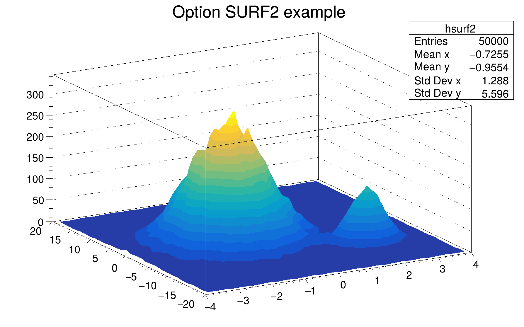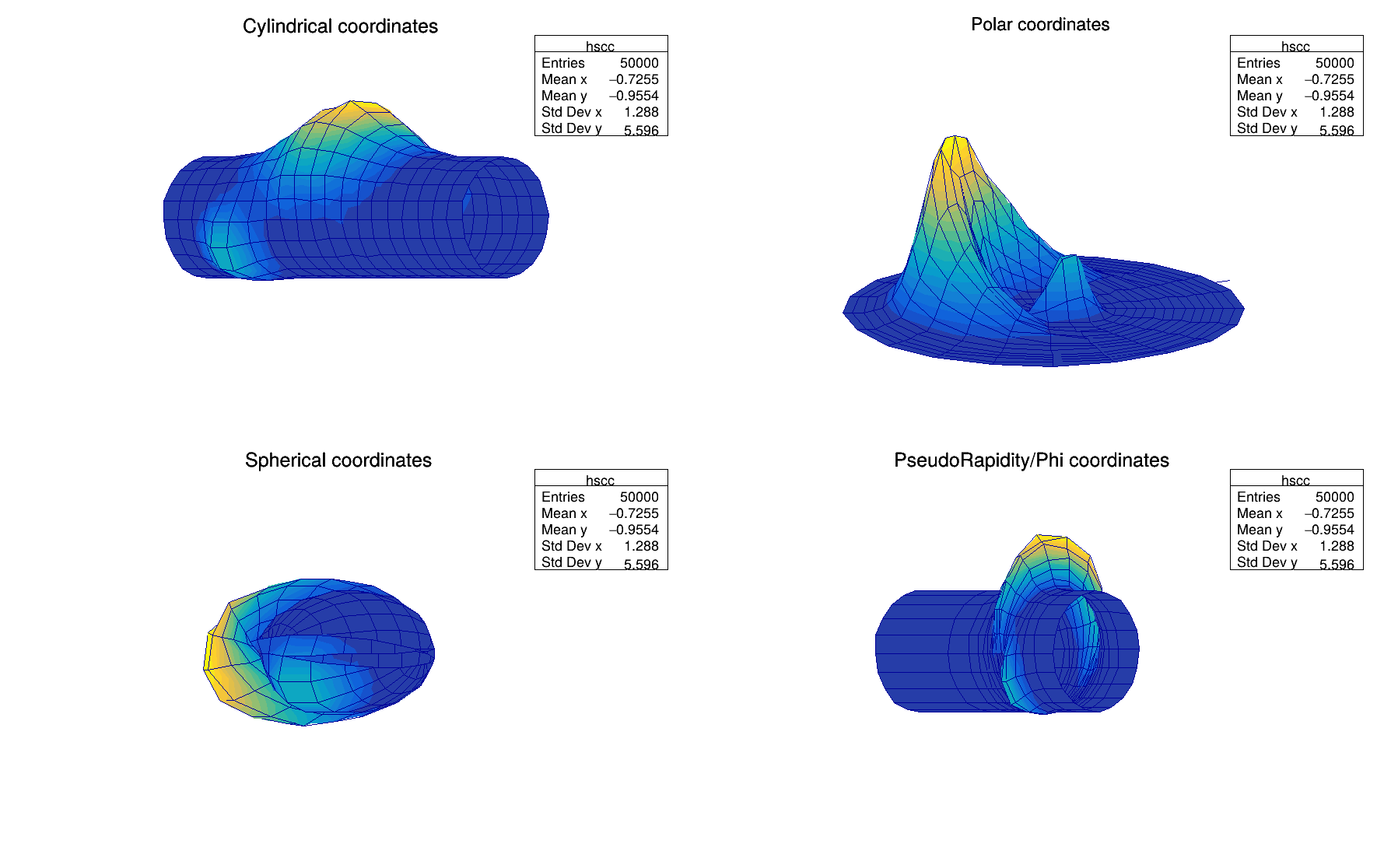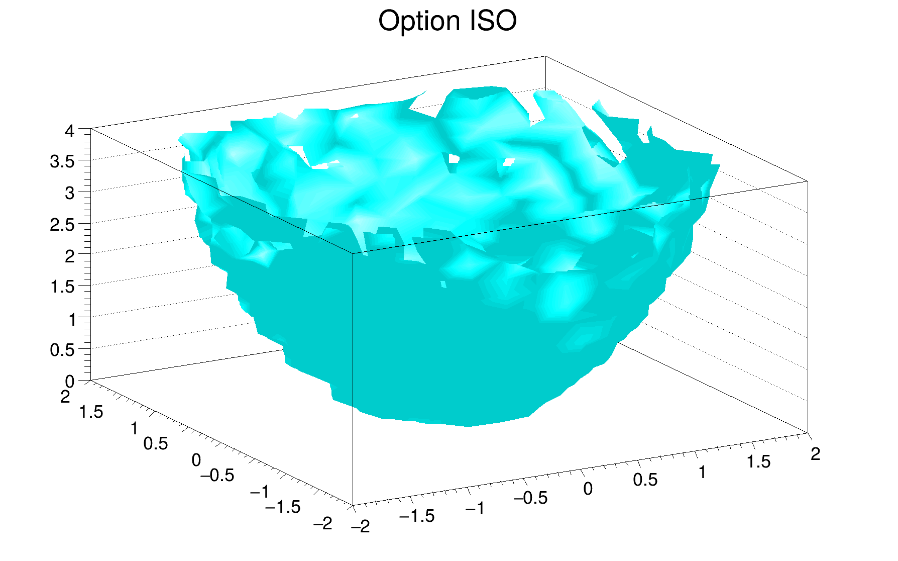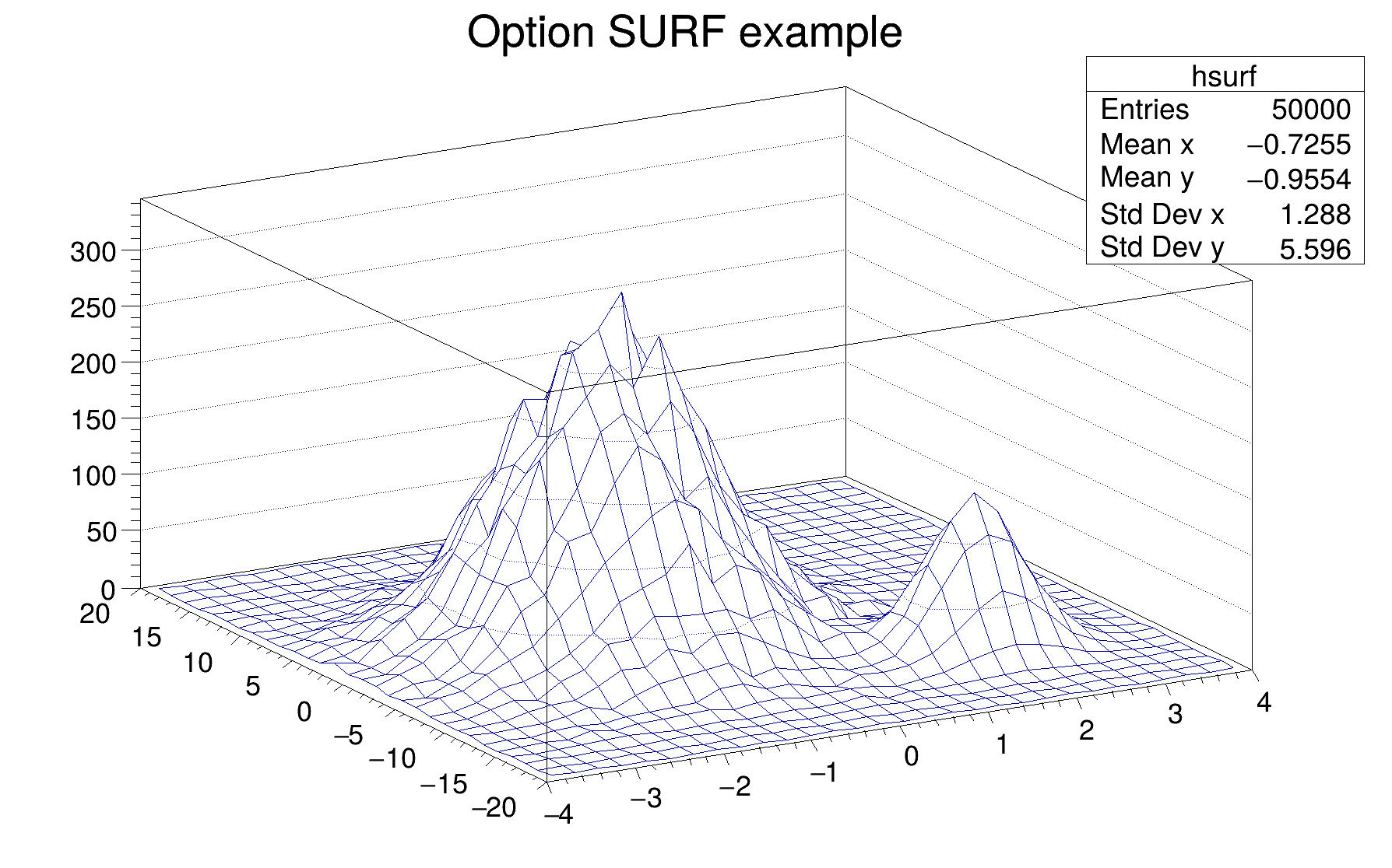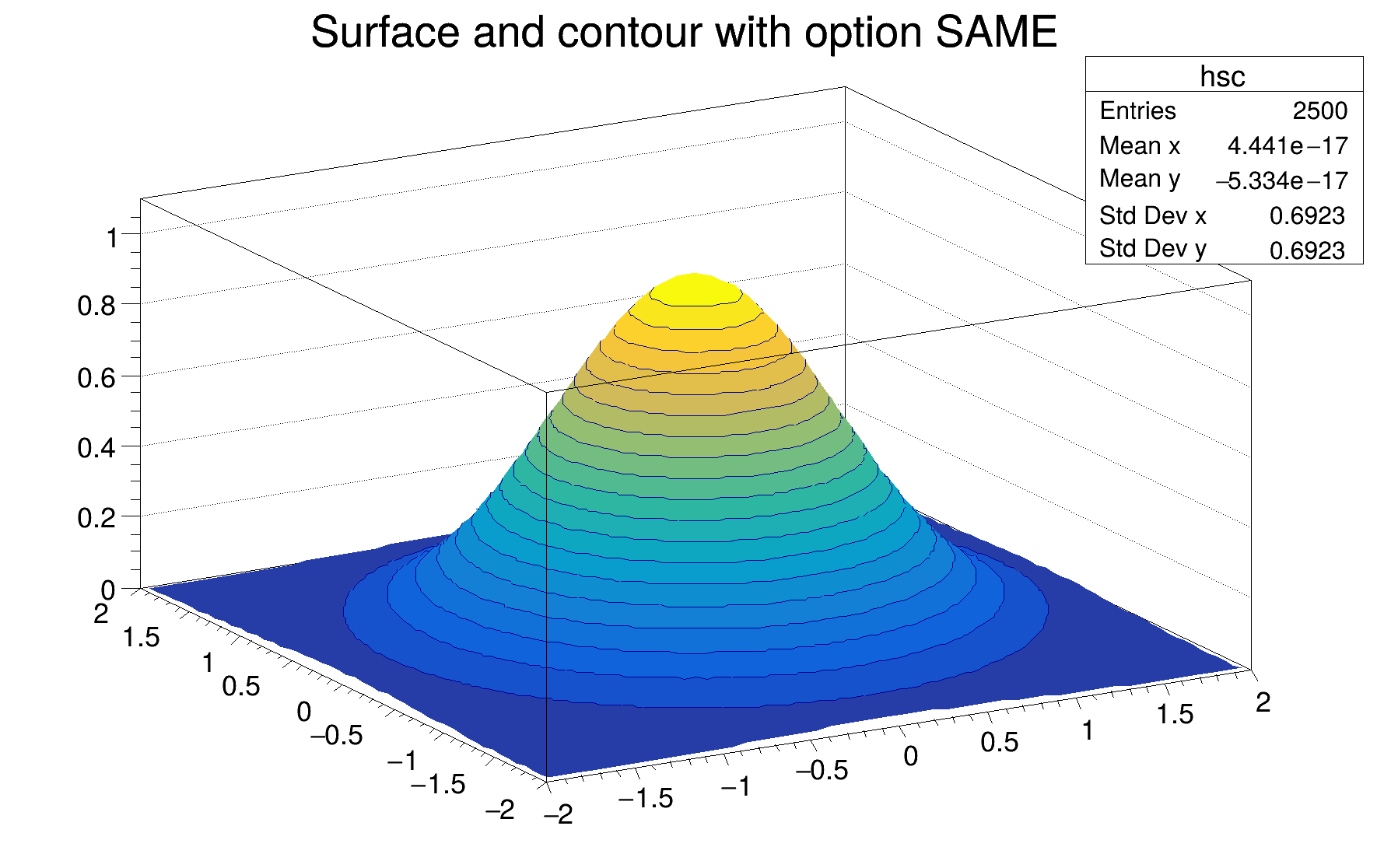 h can be of any kind: 1D, 2D or 3D. To choose how the histogram will be drawn, the Draw() method can be invoked with an option. For instance to draw a 2D histogram as a lego plot it is enough to do: