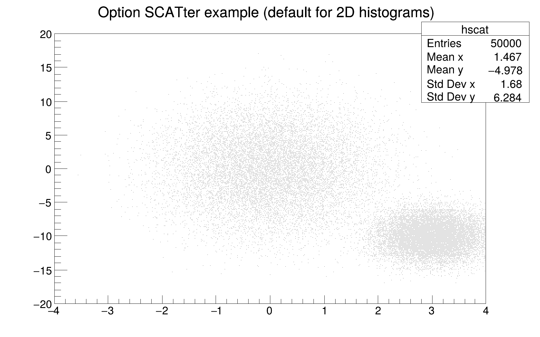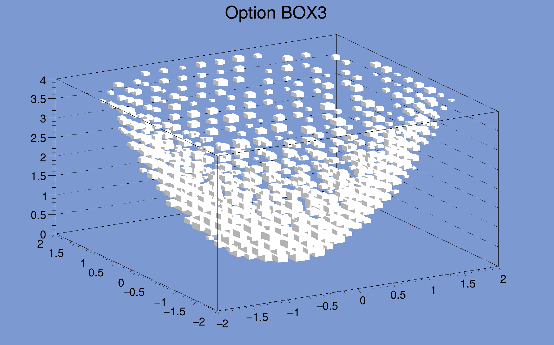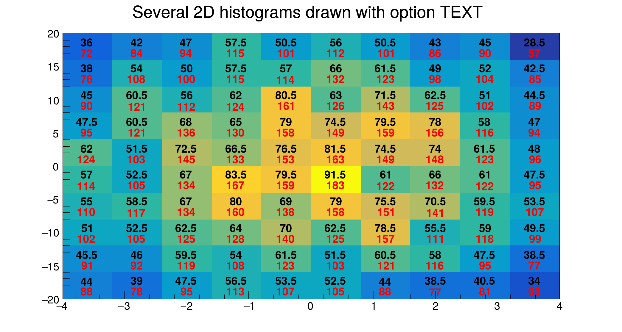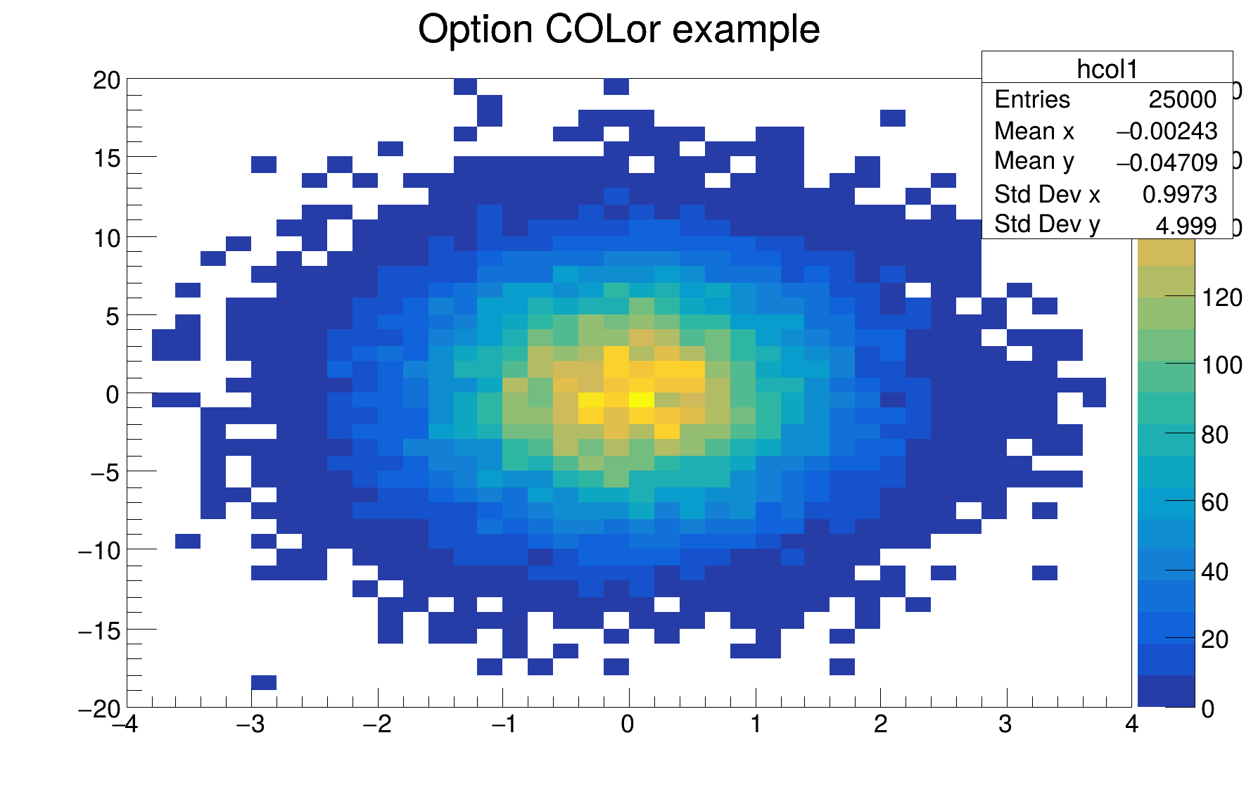 | "COL" | A box is drawn for each cell with a color scale varying with contents. All the none empty bins (bins with content and error equal to 0) are painted. Empty bins are not painted unless some bins have a negative content because in that case the null bins might be not empty. TProfile2D histograms are handled differently because, for this type of 2D histograms, it is possible to know if an empty bin has been filled or not. So even if all the bins' contents are positive some empty bins might be painted. And vice versa, if some bins have a negative content some empty bins might be not painted (default). |