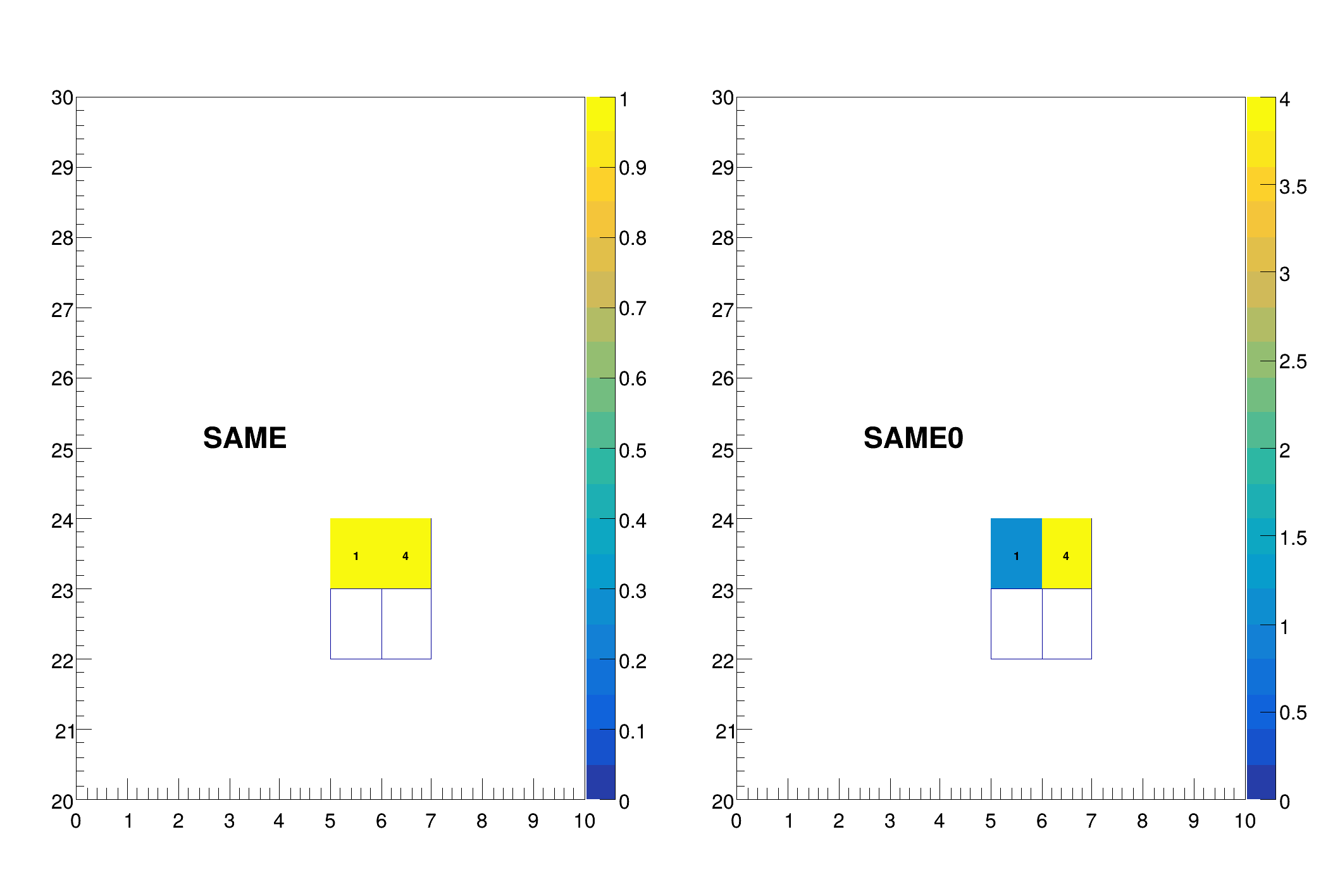 | "SAME0" | Same as "SAME" but do not use the z-axis range of the first plot. |