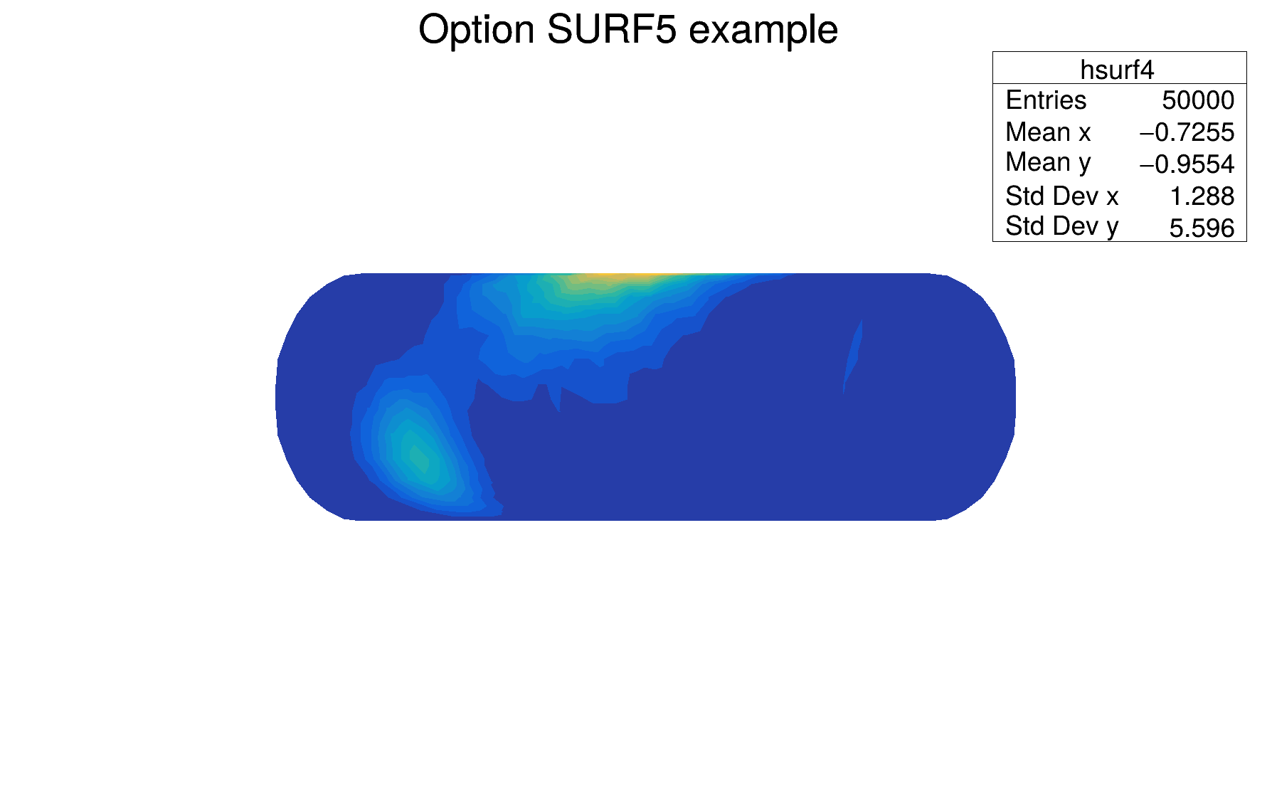 | "SURF5" | Same as SURF3 but only the colored contour is drawn. Used with option CYL, SPH or PSR it allows to draw colored contours on a sphere, a cylinder or a in pseudo rapidity space. In cartesian or polar coordinates, option SURF3 is used. |