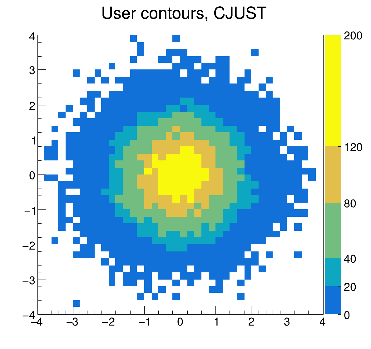 As default labels and ticks are drawn by TGAxis at equidistant (lin or log) points as controlled by SetNdivisions. If option "CJUST" is given labels and ticks are justified at the color boundaries defined by the contour levels. In this case no optimization can be done. It is responsibility of the user to adjust minimum, maximum of the histogram and/or the contour levels to get a reasonable look of the plot. Only overlap of the labels is avoided if too many contour levels are used.