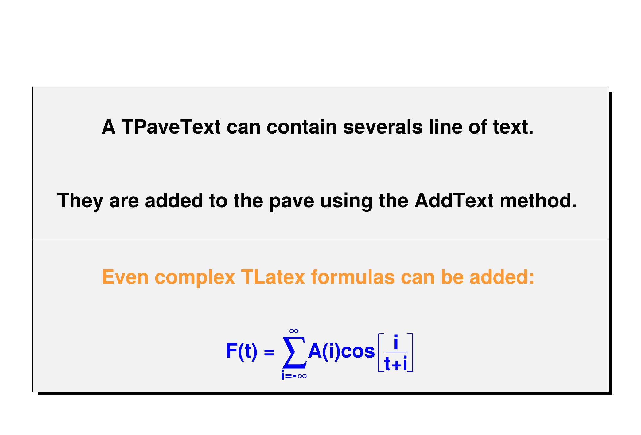 The individual text items are entered via AddText By default, text items inherits from the default pavetext AttText. A title can be added later to this pavetext via TPaveText::SetLabel.