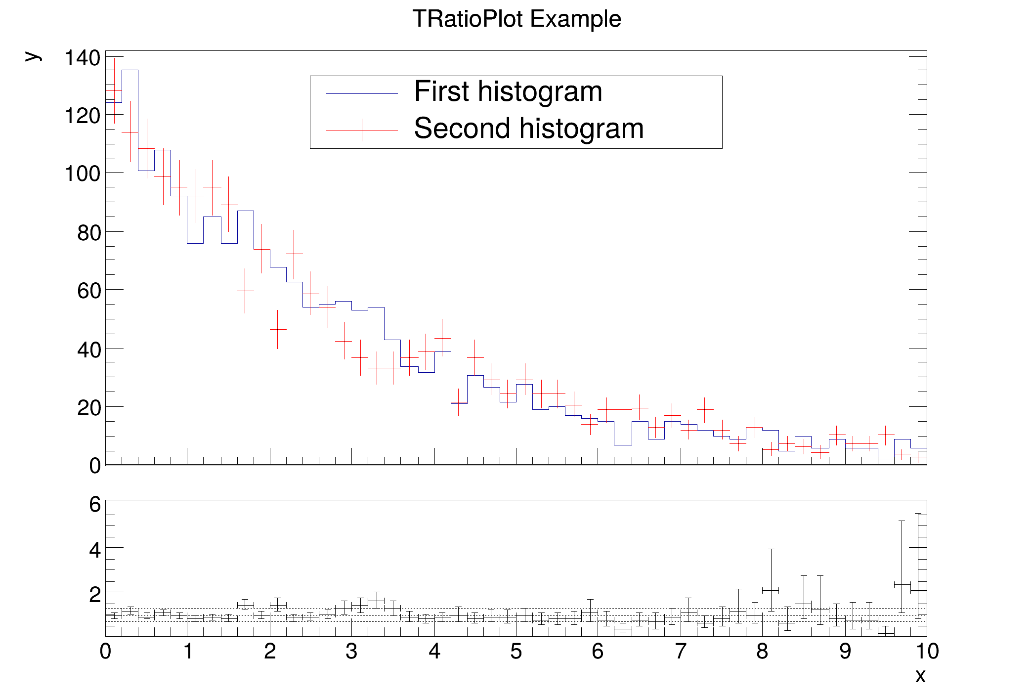 The simplest case is passing two histograms without specifying any options. This defaults to using TGraphAsymmErrors::Divide. The option variable is passed through, as are the parameters c1 and c2, that you can set via TRatioPlot::SetC1 and TRatioPlot::SetC1. If you set the option to divsym the method TH1::Divide will be used instead, also receiving all the parameters.