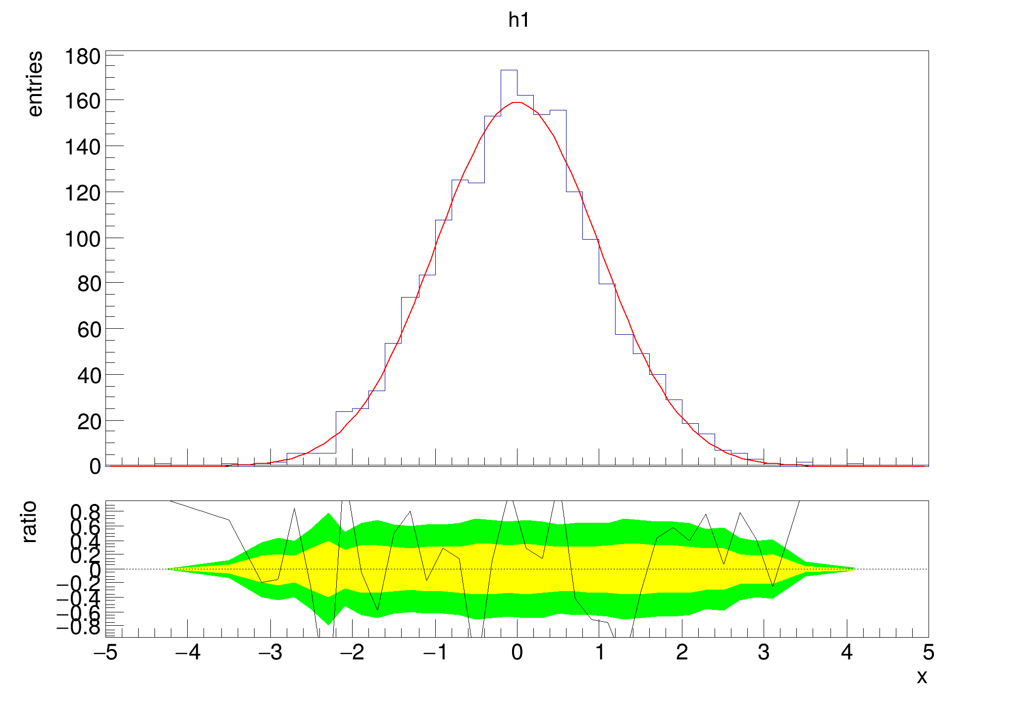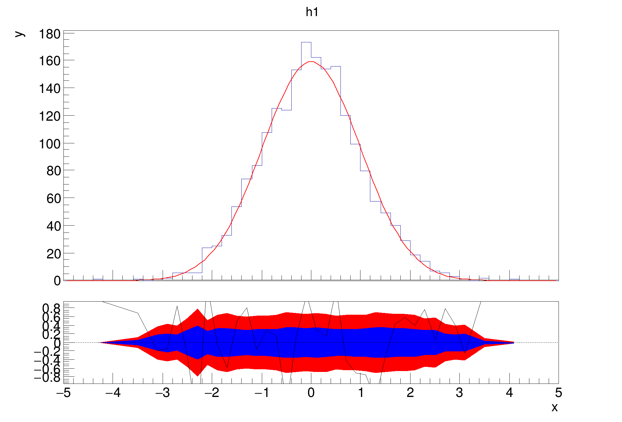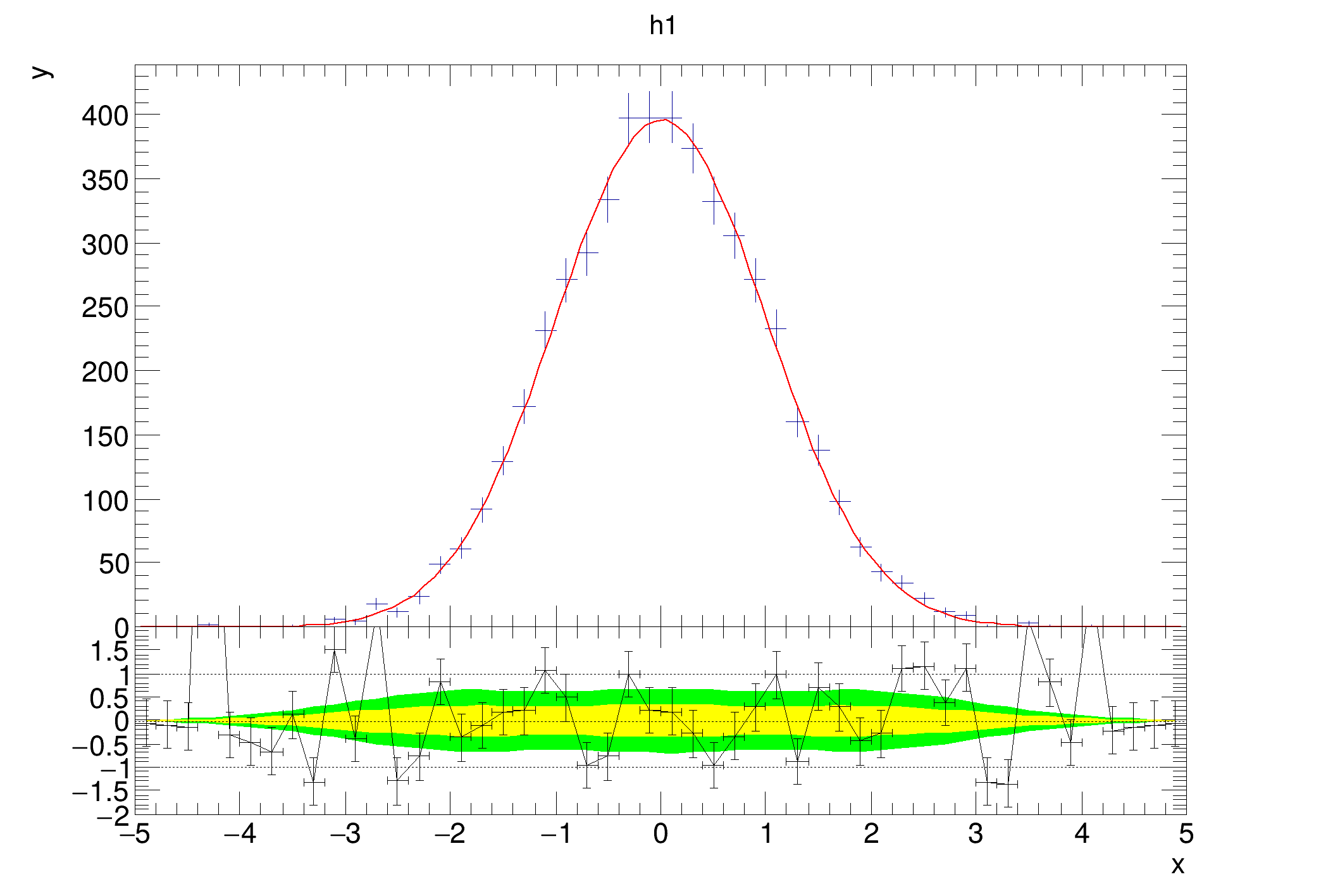 A second constructor only accepts a single histogram, but expects it to have a fitted function. The function is used to calculate the residual between the fit and the histogram. Here, it is expected that h1 has a fit function in it's list of functions. The class calculates the difference between the histogram and the fit function at each point and divides it by the uncertainty. There are a few option to steer which error is used (as is the case for diffsig). The default is to use the statistical uncertainty from h1 using TH1::GetBinError. If the option string contains errasym, asymmetric errors will be used. The type of error can be steered by TH1::SetBinErrorOption. The corresponding error will be used, depending on if the function is below or above the bin content. The third option errfunc uses the square root of the function value as the error.