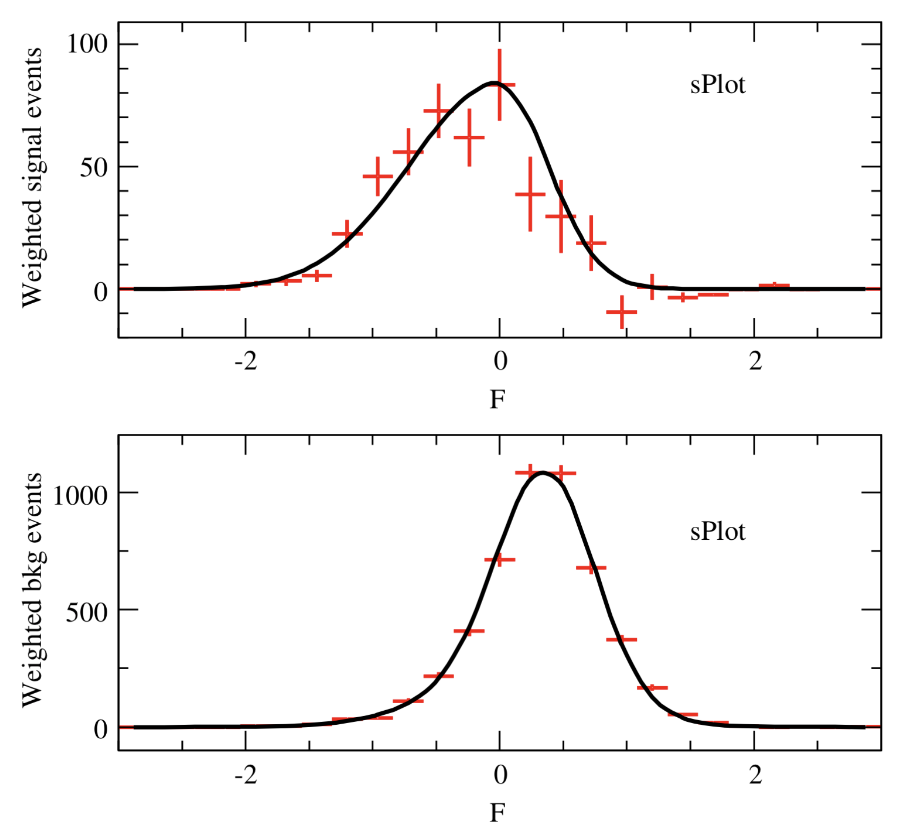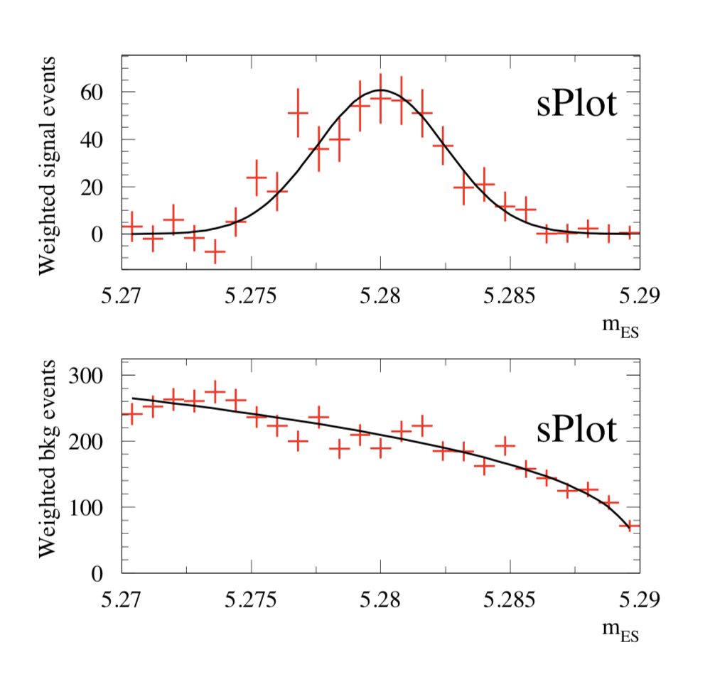 Choosing \(\Delta E\) and \({\cal F}\) as discriminating variables to determine \(N_1\) and \(N_2\) through a maximum Likelihood fit, one builds, for the control variable \({m_{\rm ES}}\) which is unknown to the fit, the two \(\hbox {$_s$}{\cal P}lots\) for signal and background shown in Fig. 3. One observes that the \(\hbox{$_s$}{\cal P}lot\) for signal reproduces correctly the PDF even where the latter vanishes, although the error bars remain sizeable. This results from the almost complete cancellation between positive and negative weights: the sum of weights is close to zero while the sum of weights squared is not. The occurrence of negative weights occurs through the appearance of the covariance matrix, and its negative components, in the definition of Eq. (2).