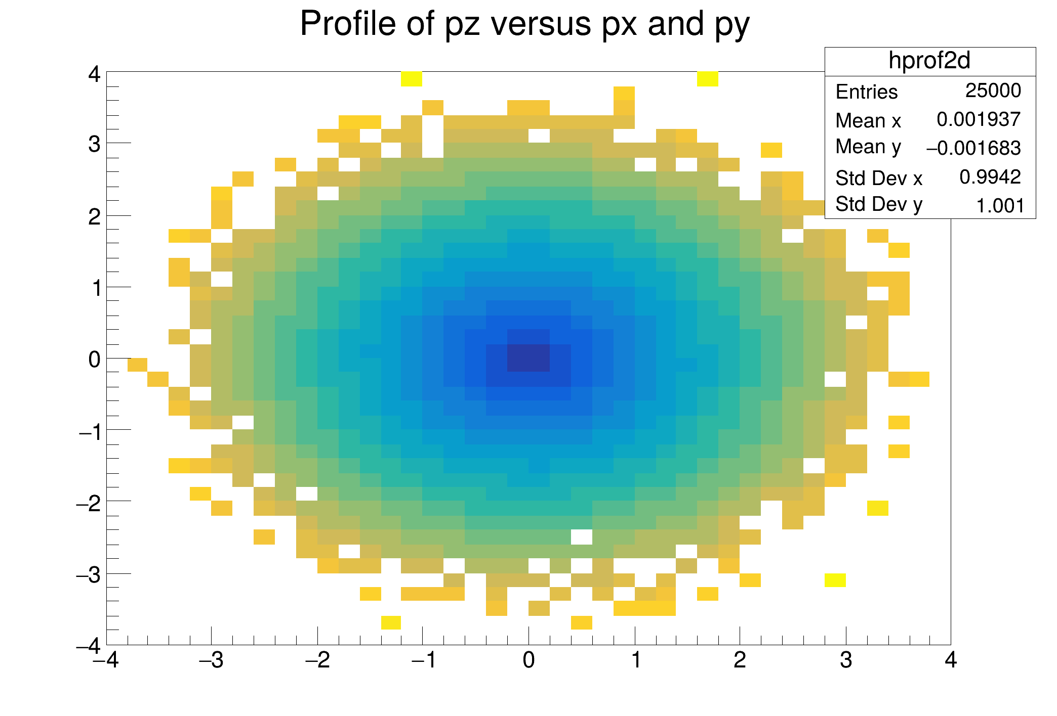 "Profile of pz versus px and py", 40, -4, 4, 40, -4, 4, 0, 20),