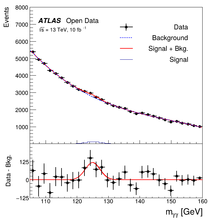 This tutorial is the Higgs to two photons analysis from the ATLAS Open Data release in 2020 (http://opendata.atlas.cern/release/2020/documentation/). The data was taken with the ATLAS detector during 2016 at a center-of-mass energy of 13 TeV. Although the Higgs to two photons decay is very rare, the contribution of the Higgs can be seen as a narrow peak around 125 GeV because of the excellent reconstruction and identification efficiency of photons at the ATLAS experiment.