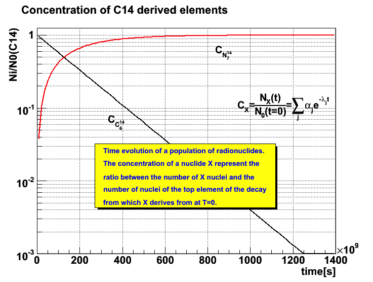 All radionuclides in the output population list have attached objects that represent the time evolution of their fraction of nuclei with respect to the top radionuclide in the decay chain. These objects (Bateman solutions) can be retrieved and drawn: