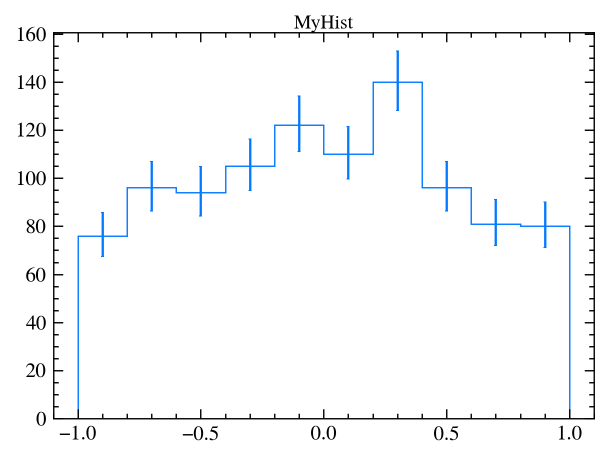 nbins+1 where 0 is the underflow bin and nbins+1 is the overflow (see conventions for numbering bins). In contrast, UHI inherits 0-based indexing from numpy array conventions where 0 is the first valid element and n-1 is the last valid element. Our implementation complies with the UHI conventions by implementing the following syntax:h[underflow] returns the underflow bin (equivalent to h.GetBinContent(0)).h[0] returns the first valid bin (equivalent to h.GetBinContent(1)).h[-1] returns the last valid bin (equivalent to h.GetBinContent(nbins)).h[overflow] returns the overflow bin (equivalent to h.GetBinContent(nbins+1)).sumans = h[a:b:sum] --> ans is the integral value.