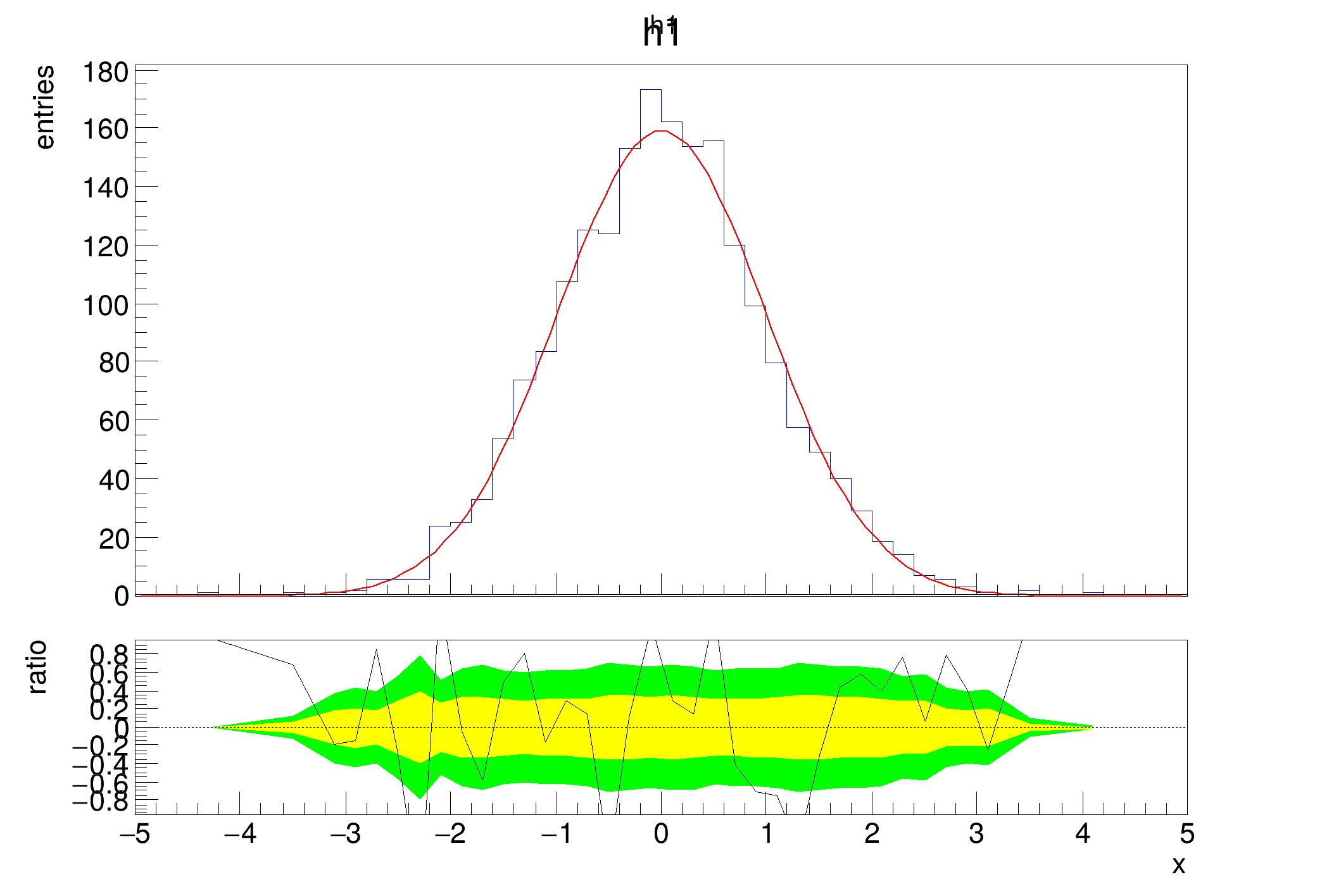 Creates a histogram filled with random numbers from a gaussian distribution and fits it with a standard gaussian function. The result is passed to the TRatioPlot constructor. Additionally, after calling TRatioPlot::Draw the upper and lower y axis titles are modified. Confidence interval bands are automatically drawn on the bottom (but can be disabled by draw option nobands). Inspired by the tutorial of Paul Gessinger.