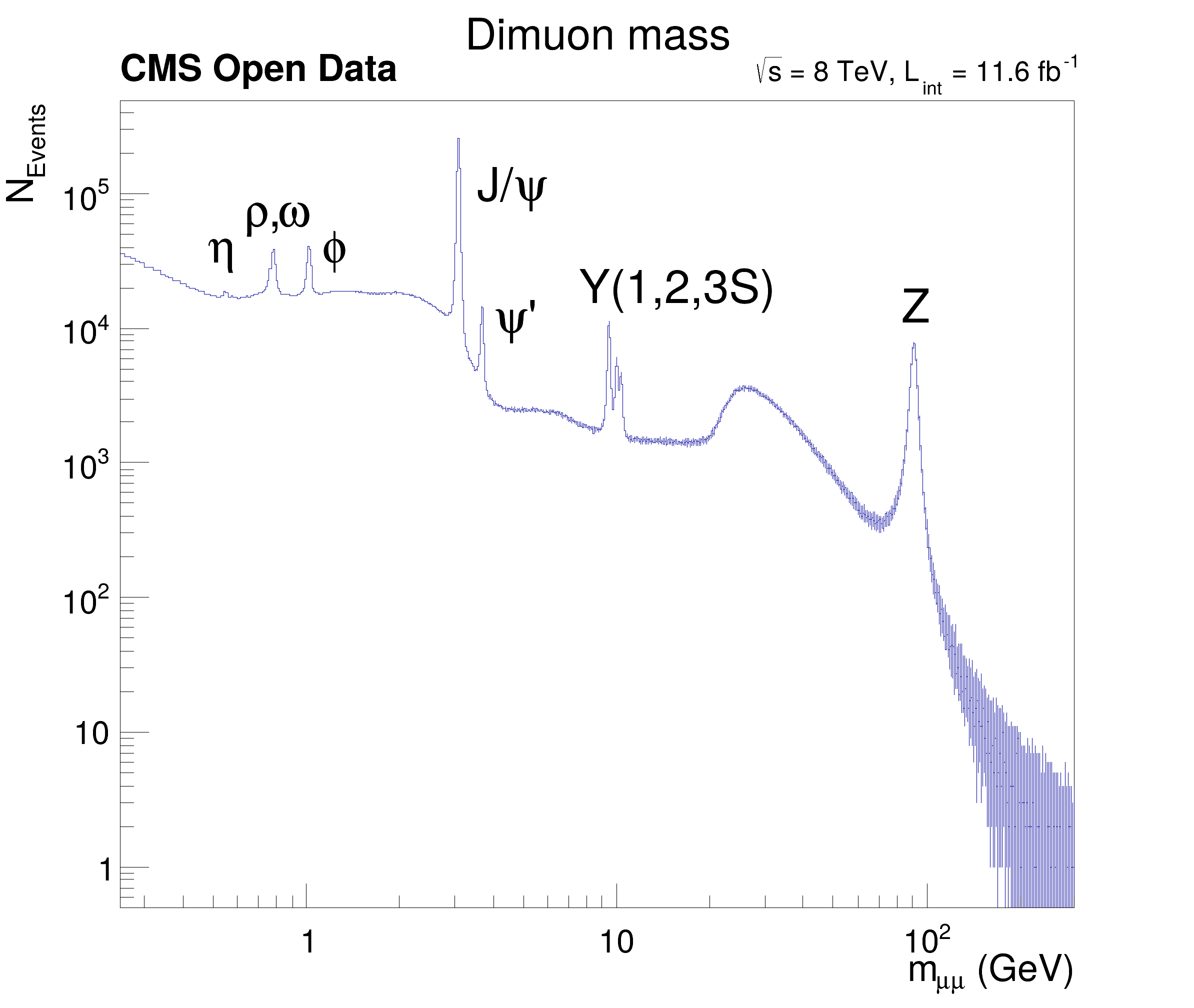 This tutorial is based on df102_NanoAODDimuonAnalysis.C. It illustrates how NanoAOD files can be processed with ROOT dataframes. The NanoAOD-like input files are filled with 66 mio. events from CMS OpenData containing muon candidates part of 2012 dataset (DOI: 10.7483/OPENDATA.CMS.YLIC.86ZZ and DOI: 10.7483/OPENDATA.CMS.M5AD.Y3V3). The macro matches muon pairs and produces an histogram of the dimuon mass spectrum showing resonances up to the Z mass. Note that the bump at 30 GeV is not a resonance but a trigger effect.