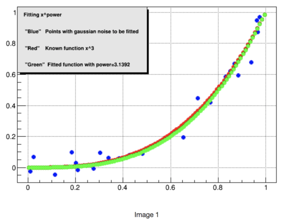 In the first image you can see the blue dots which are the function x^3 with gaussian noise, the red dots correspond to the original function and the green ones correspond to the fitted function.