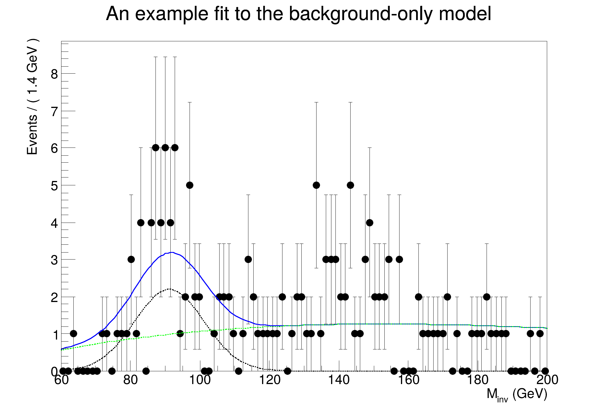 The macro creates a simple signal model and two background models, which are added to a RooWorkspace. The macro creates a toy dataset, and then uses a RooStats ProfileLikleihoodCalculator to do a hypothesis test of the background-only and signal+background hypotheses. In this example, shape uncertainties are not taken into account, but normalization uncertainties are.