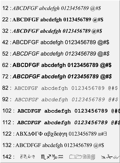 TCanvas * fonts() { TCanvas *Tf = new TCanvas("Tf", "Tf",0,0,500,700); Tf->Range(0,0,1,1); Tf->SetBorderSize(2); Tf->SetFrameFillColor(0); double y = 0.95; for (int f = 12; f<=142; f+=10) { if (f<142) drawtext(0.02,y, f,"ABCDFGF abcdefgh 0123456789 @#$"); else drawtext(0.02,y, f,"ABCD efgh 01234 @#$"); y- = 0.07; } return Tf; } void drawtext(double x, double y, int f, char *s) { TLatex *t = new TLatex(x,y,Form("#font[41]{%d :} %s",f,s)); t->SetTextFont(f); t->SetTextAlign(12); t->Draw(); }