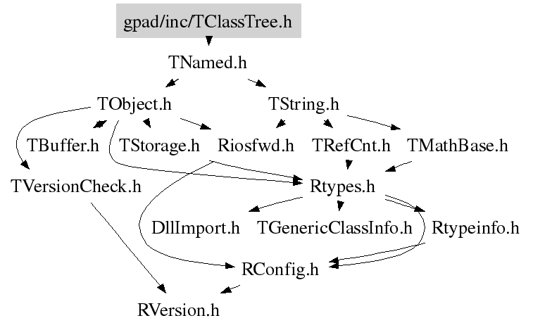 Draw inheritance tree and their relations for a list of classes The following options are supported - Direct inheritance (default) - Multiple inheritance - Composition - References by data members and member functions - References from Code The list of classes is specified: - either in the TClassTree constructor as a second argument - or the parameter to TClassTRee::Draw Note that the ClassTree viewer can also be started from the canvas pull down menu "Classes". In the list of classes, class names are separated by a ":" wildcarding is supported. The following formats are supported, eg in TClassTree::Draw 1- Draw("ClassA") Draw inheritance tree for ClassA Show all classes referenced by ClassA 2- Draw("*ClassB") Draw inheritance tree for ClassB and all the classes deriving from ClassB 3- Draw(">ClassC") Draw inheritance tree for ClassC Show classes referencing ClassC 4- Draw("ClassD<") Draw inheritance tree for ClassD Show classes referenced by ClassD Show all classes referencing ClassD 5- Draw("Cla*") Draw inheritance tree for all classes with name starting with "Cla" Show classes referenced by these classes 6- Draw("ClassA:ClassB<") Draw inheritance tree for ClassA Show all classes referenced by ClassA Draw inheritance tree for ClassB Show classes referenced by ClassB Show all classes referencing ClassB example; Draw("TTree<") Draw inheritance tree for the Root class TTree Show all classes referenced by TTree Show all classes using TTree By default, only direct inheritance is drawn. Use TClassTree::ShowLinks(option) to show additional references option = "H" to show links to embedded classes option = "M" to show multiple inheritance option = "R" to show pointers to other classes from data members option = "C" to show classes used by the code(implementation) of a class The following picture is produced directly by: TClassTree ct("ct","*TH1") It shows all the classes derived from the base class TH1./*