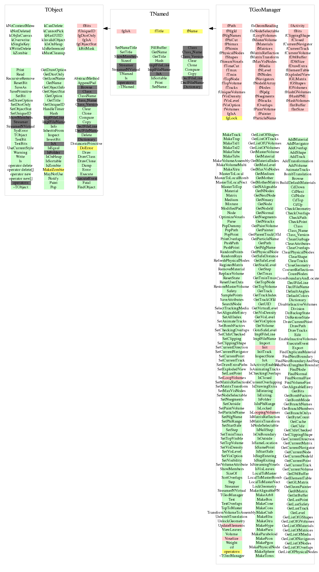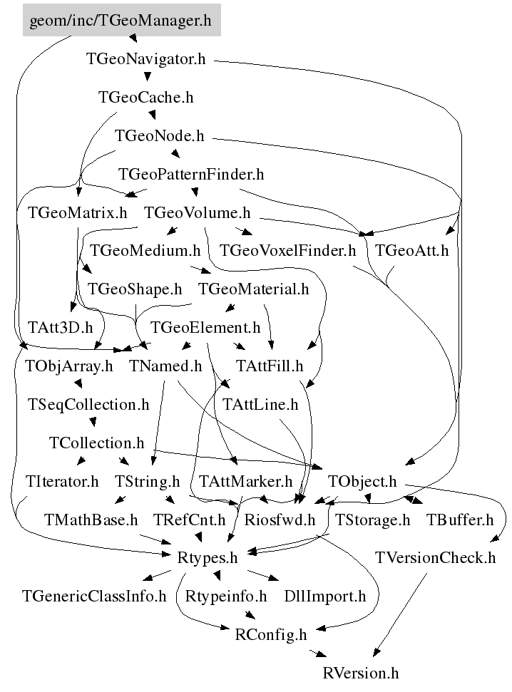 TGeoManager - the manager class for the geometry package. TGeoManager class is embedding all the API needed for building and tracking a geometry. It defines a global pointer (gGeoManager) in order to be fully accessible from external code. The mechanism of handling multiple geometries at the same time will be soon implemented. TGeoManager is the owner of all geometry objects defined in a session, therefore users must not try to control their deletion. It contains lists of media, materials, transformations, shapes and volumes. Logical nodes (positioned volumes) are created and destroyed by the TGeoVolume class. Physical nodes and their global transformations are subjected to a caching mechanism due to the sometimes very large memory requirements of logical graph expansion. The caching mechanism is triggered by the total number of physical instances of volumes and the cache manager is a client of TGeoManager. The manager class also controls the painter client. This is linked with ROOT graphical libraries loaded on demand in order to control visualization actions. Rules for building a valid geometry A given geometry can be built in various ways, but there are mandatory steps that have to be followed in order to be validated by the modeler. There are general rules : volumes needs media and shapes in order to be created, both container an containee volumes must be created before linking them together, and the relative transformation matrix must be provided. All branches must have an upper link point otherwise they will not be considered as part of the geometry. Visibility or tracking properties of volumes can be provided both at build time or after geometry is closed, but global visualization settings (see TGeoPainter class) should not be provided at build time, otherwise the drawing package will be loaded. There is also a list of specific rules : positioned daughters should not extrude their mother or intersect with sisters unless this is specified (see TGeoVolume::AddNodeOverlap()), the top volume (containing all geometry tree) must be specified before closing the geometry and must not be positioned - it represents the global reference frame. After building the full geometry tree, the geometry must be closed (see TGeoManager::CloseGeometry()). Voxelization can be redone per volume after this process. Below is the general scheme of the manager class./*