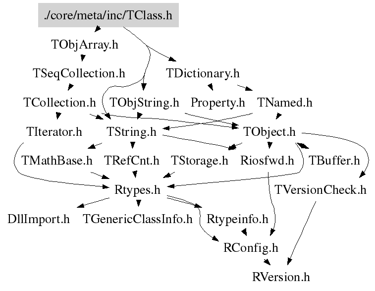 The ROOT global object gROOT contains a list of all defined classes. This list is build when a reference to a class dictionary is made. When this happens, the static "class"::Dictionary() function is called to create a TClass object describing the class. The Dictionary() function is defined in the ClassDef macro and stored (at program startup or library load time) together with the class name in the TClassTable singleton object. For a description of all dictionary classes see TDictionary.