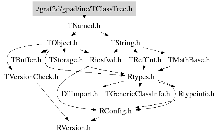 Draw inheritance tree and their relations for a list of classes The following options are supported - Direct inheritance (default) - Multiple inheritance - Composition - References by data members and member functions - References from Code The list of classes is specified: - either in the TClassTree constructor as a second argument - or the parameter to TClassTRee::Draw Note that the ClassTree viewer can also be started from the canvas pull down menu "Classes". In the list of classes, class names are separated by a ":" wildcarding is supported. The following formats are supported, eg in TClassTree::Draw 1- Draw("ClassA") Draw inheritance tree for ClassA Show all classes referenced by ClassA 2- Draw("*ClassB") Draw inheritance tree for ClassB and all the classes deriving from ClassB 3- Draw(">ClassC") Draw inheritance tree for ClassC Show classes referencing ClassC 4- Draw("ClassD<") Draw inheritance tree for ClassD Show classes referenced by ClassD Show all classes referencing ClassD 5- Draw("Cla*") Draw inheritance tree for all classes with name starting with "Cla" Show classes referenced by these classes 6- Draw("ClassA:ClassB<") Draw inheritance tree for ClassA Show all classes referenced by ClassA Draw inheritance tree for ClassB Show classes referenced by ClassB Show all classes referencing ClassB example; Draw("TTree<") Draw inheritance tree for the Root class TTree Show all classes referenced by TTree Show all classes using TTree By default, only direct inheritance is drawn. Use TClassTree::ShowLinks(option) to show additional references option = "H" to show links to embedded classes option = "M" to show multiple inheritance option = "R" to show pointers to other classes from data members option = "C" to show classes used by the code(implementation) of a class The following picture is produced directly by: TClassTree ct("ct","*TH1") It shows all the classes derived from the base class TH1./*